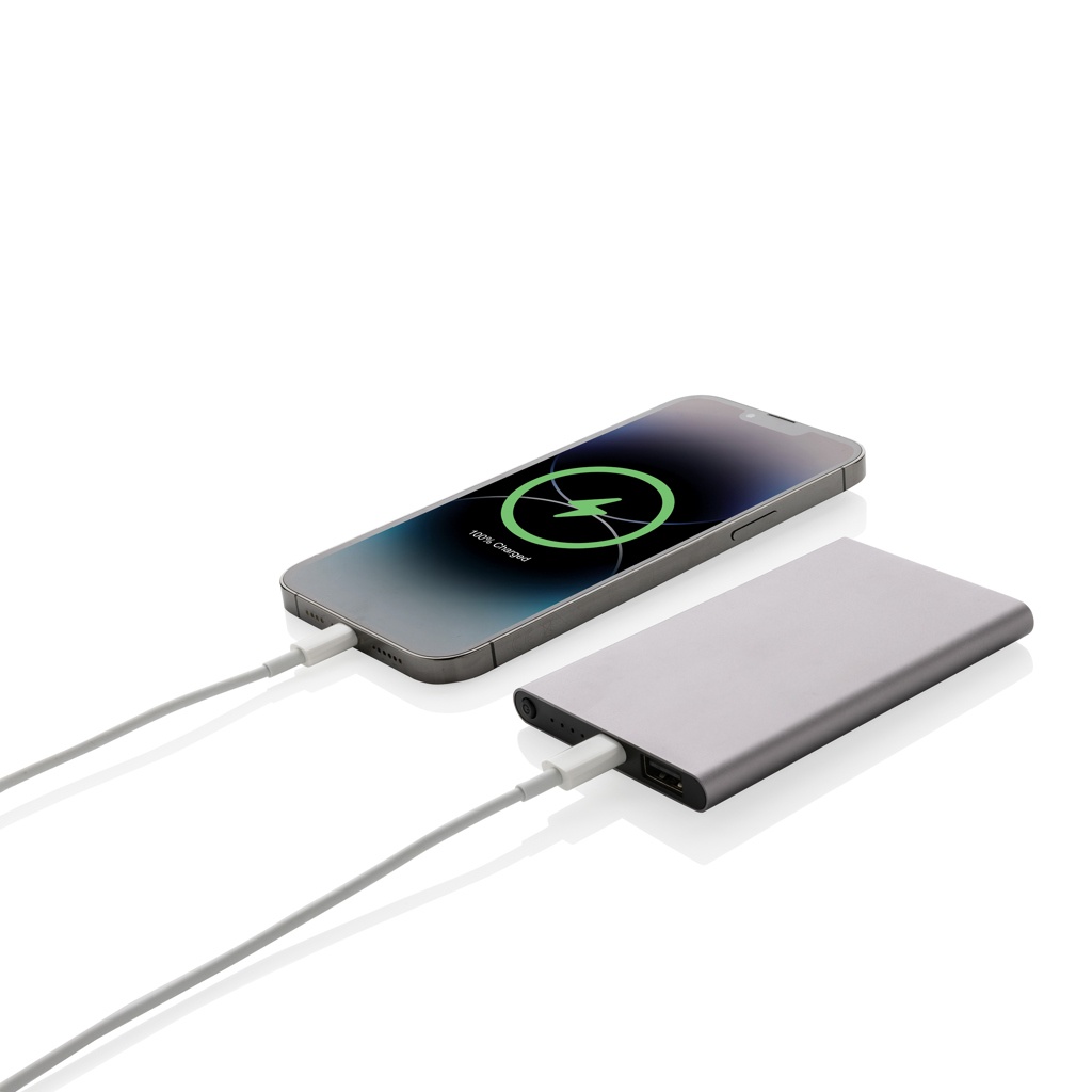4.000 mAh flat design powerbank with the case made out of RCS certified recycled Aluminum/ABS plastic. RCS (Recycled Claim Standard) is a standard to verify the recycled content of a product throughout the whole supply chain. Total recycled content: 36 % based on total item weight. The powerbank supports both charging via USB A as well as type C. The powerbank contains a long lasting grade A 4.000 mAh lithium polymer battery. The power indicators will indicate the remaining energy level so you always know when to re-charge.; Type-C Input 5V/2A; Type C output:5V/2A USB A output: 5V/2A. Item and accessories PVC free. Including RCS certified recycled TPE charging cable. Packed in FSC® mix packaging.