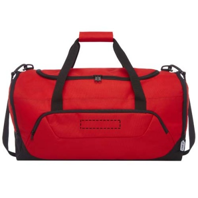 Durable duffel bag made out of 100% GRS certified recycled, post-consumer plastic which contributes to the reduction of plastic waste. Features large main compartment and front zipper pocket, padded shoulder strap, and padded handles. Approximately 27 bottles are recycled to make this bag.