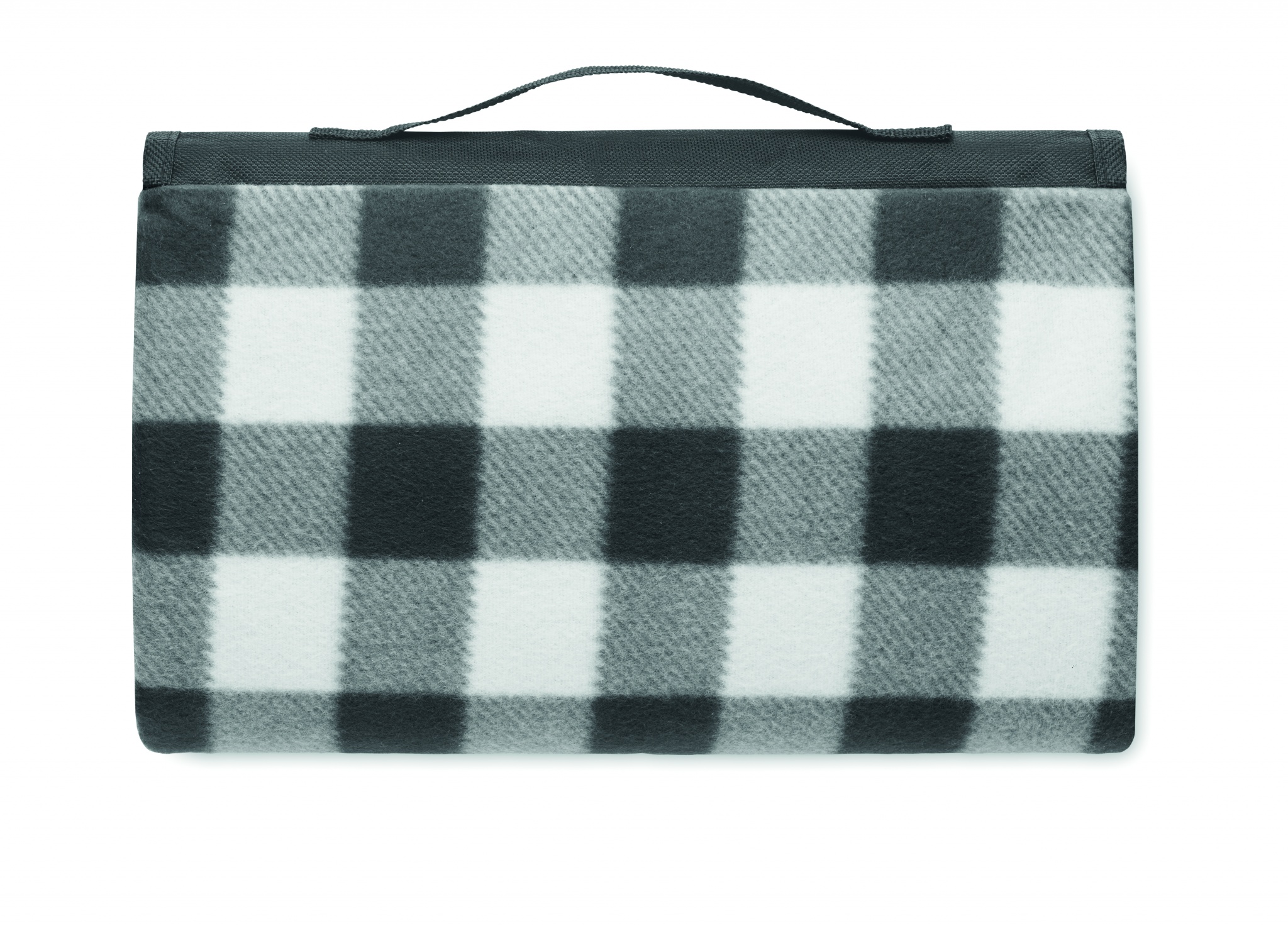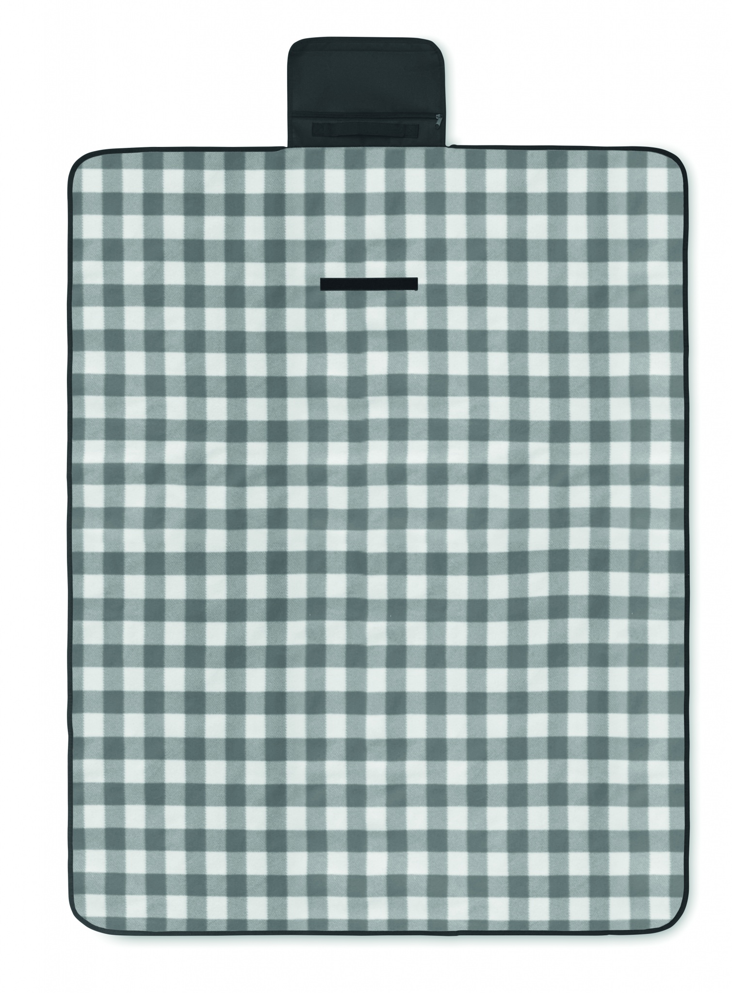 Foldable RPET 150 gr/m² polar fleece picnic blanket with water resistant coated PEVA reverse side. Includes a front zipper pocket and short carry strap.