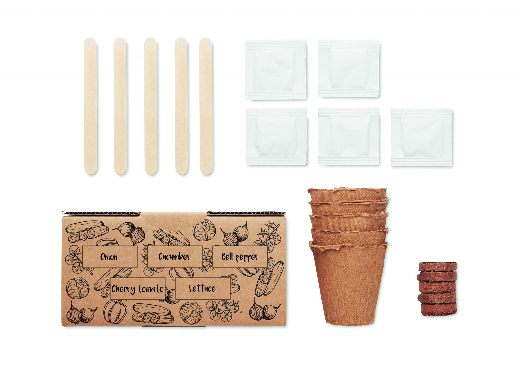 Salad growing kit. Box with Onion, cucumber, bell pepper, cherry tomato and lettuce seeds. Made in EU. Not available for sale in the UK .Soil tablet included.