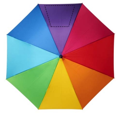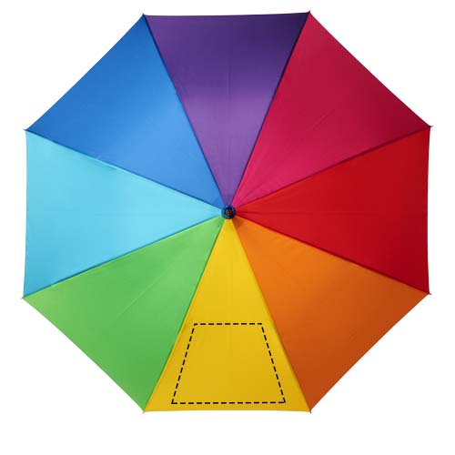 Automatic opening umbrella with a rainbow coloured pongee polyester canopy. Sturdy metal shaft, high quality full fiberglass frame offering maximum flexibility in windy conditions. Soft touch crooked handle and nickel plated tips and top. Large decoration area on any panel possible offering different creative logo solutions.