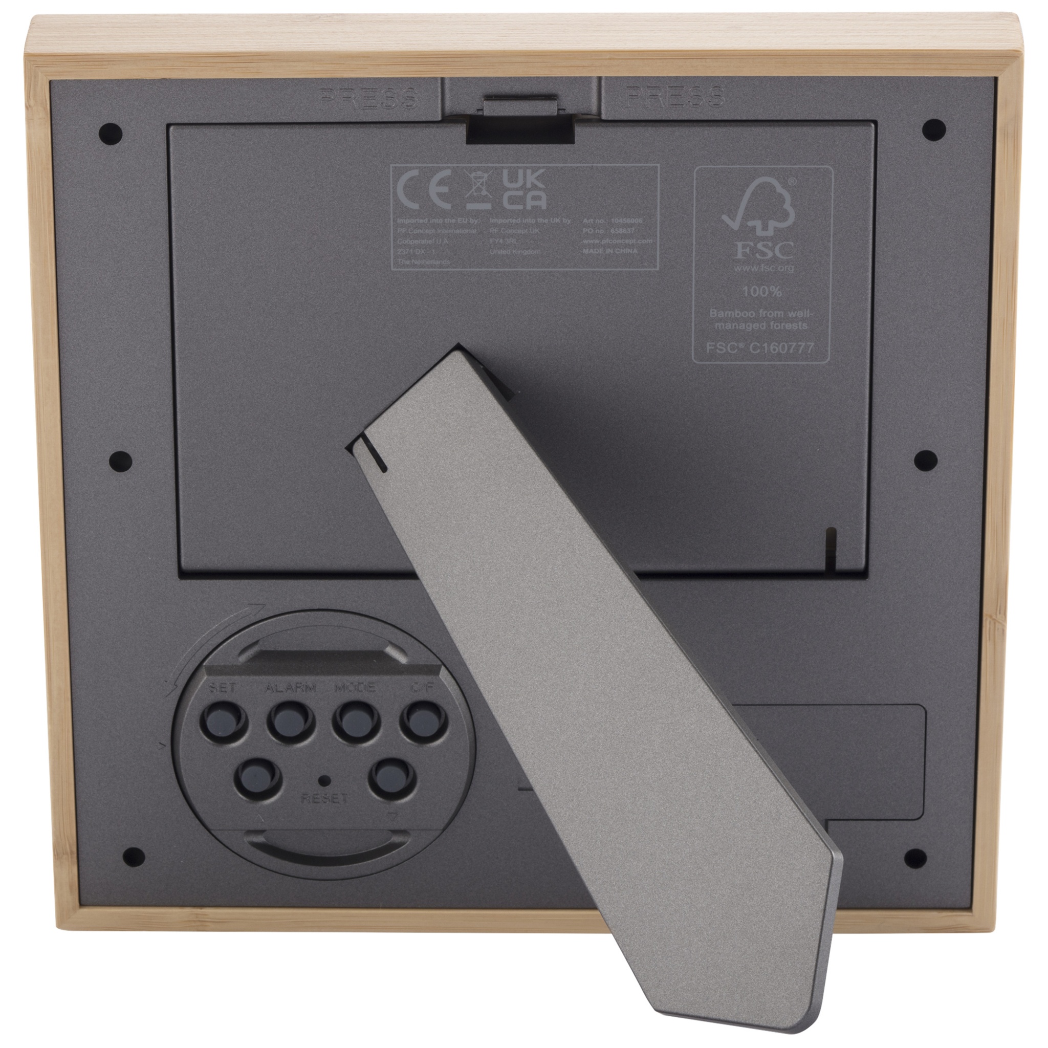 The Sasa bamboo photo frame provides a stylish and functional addition to your home or office. With the main casing of responsibly sourced bamboo and the back case of recycled plastic, this photo frame exudes natural elegance while promoting sustainability. The frame has LCD glass ensuring a clear and sharp display of the time, month, date, day of the week, and temperature in normal mode. It also features an alarm/snooze function to help you start your day on time. The birthday reminder mode allows you to keep track of important dates, while the timer mode is perfect for timing tasks or activities. Additionally, the music appreciation mode offers a selection of up to 7 optional songs for your enjoyment. The photo window size is 127 x 89 mm. Includes 2 AA batteries. Delivered with kraft paper gift box and an instruction manual.