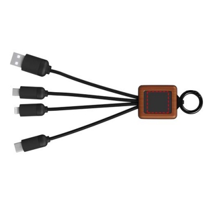 3-in-1 wooden cable with light-up logo and 3 connectors (Type-C/micro USB/iPhone), and cords made of Recycled PET plastic. The cable can charge up to 3 devices at the same time. Patent EUROPE EUIPO.
