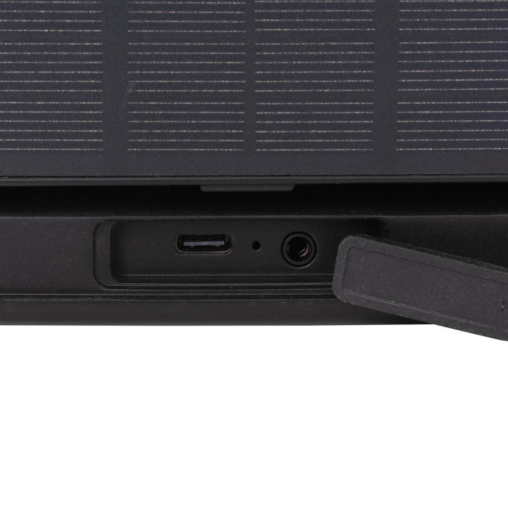 Powerful 12W wireless speaker with integrated large solar panel in RCS certified recycled ABS. Total recycled content: 16% based on total item weight. RCS certification ensures a completely certified supply chain of the recycled materials. The speaker uses high quality monocrystalline solar panels with 19% conversion rate. Charge rate depends on conditions. With integrated LED lamp to use the speaker even when the sun has set. The speaker is equipped with a 2000 mAh battery to ensure up to 8 hours of playing time and BT5.3 for smooth connection and clear sound. Connection range up to 10 metres. With mic and pick up function to answer calls. Charging speed solar: 5V/300mA. Packed in FSC mix FSC® box. Including RCS certified recycled TPE charging cable. Item and accessories 100% PVC free