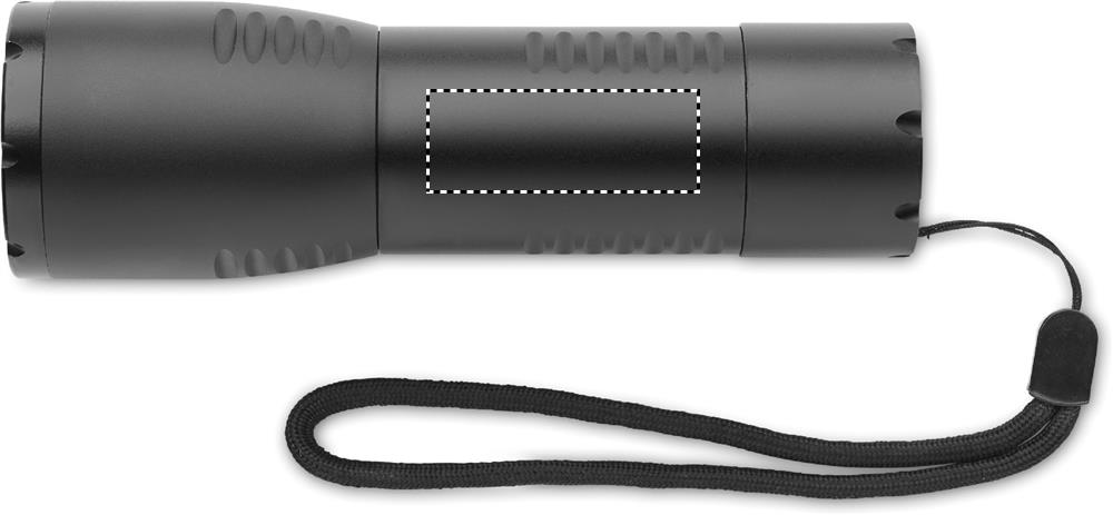 Small aluminium zoomable LED flashlight torch and detachable strap. Output: 200 lumen. 3 AA battery excluded.