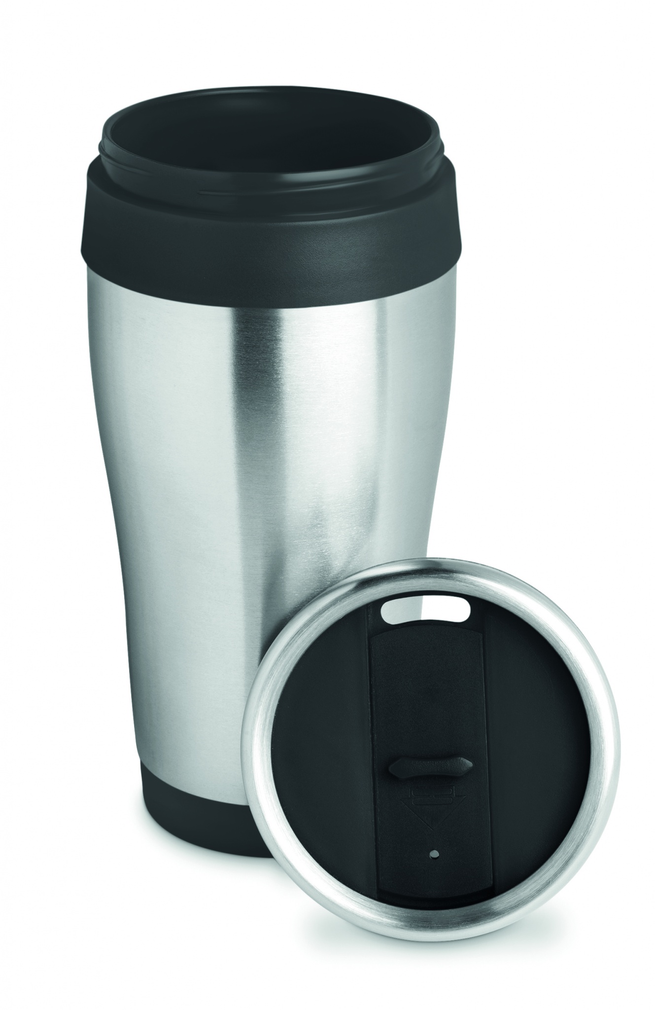 Double wall stainless steel travel cup with inner PP and lid. Capacity: 455 ml.