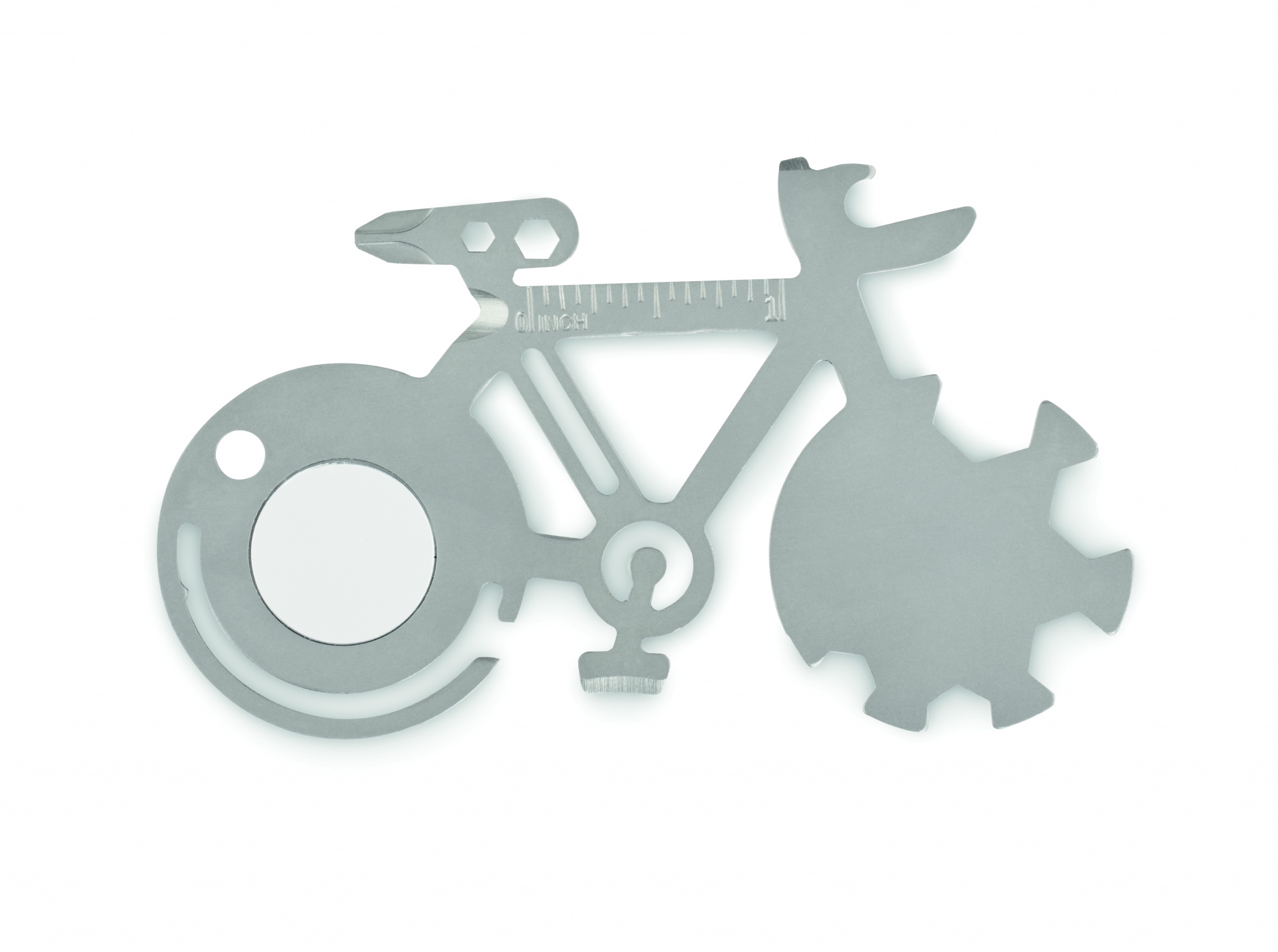 Multi-tool 11-in-1 stainless steel bicycle shaped. From bottle opener, knife, ruler or Phillips screwdriver tools.