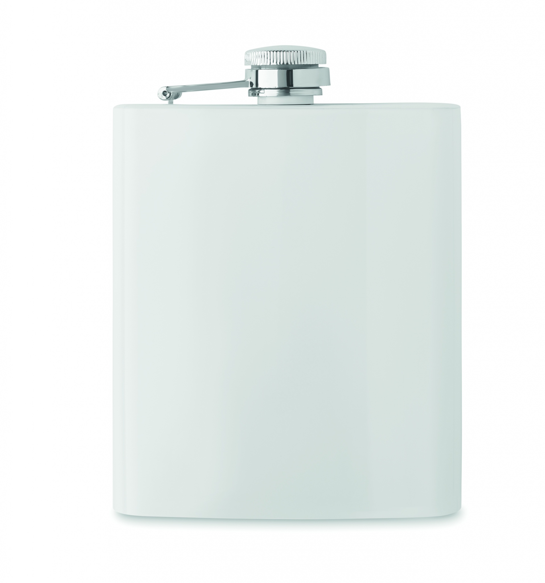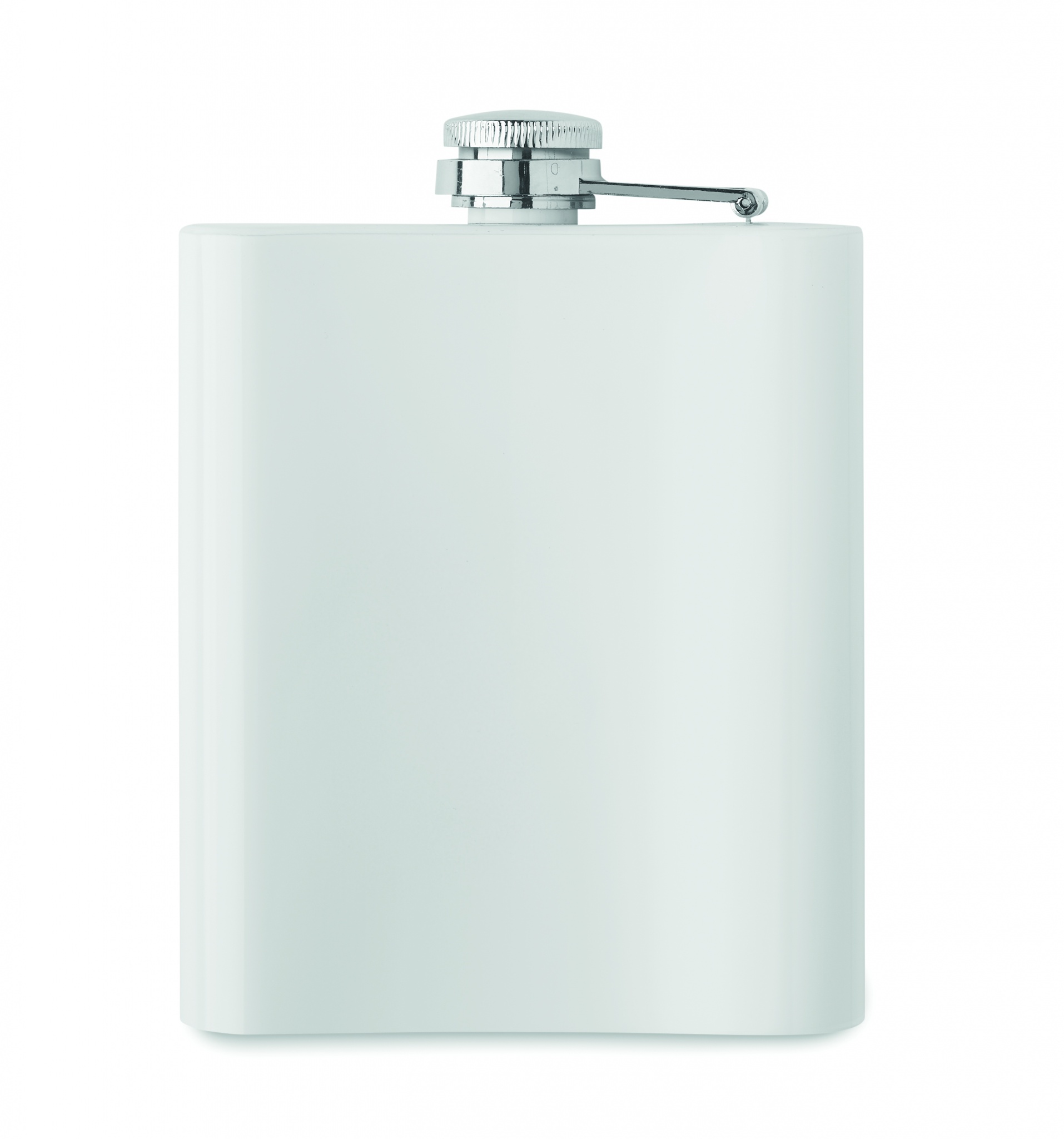 Slim hip flask in recycled stainless steel (90% recycled stainless and 10% stainless steel) with sublimation layer. Single wall. Capacity: 180 ml.