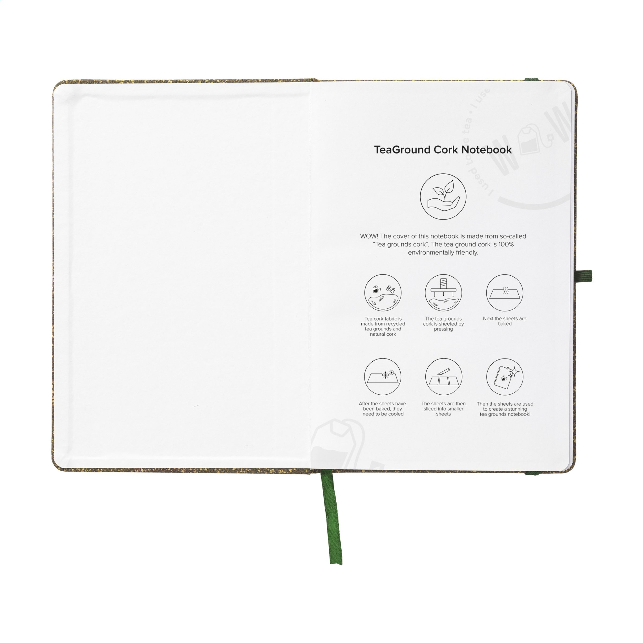 WoW! Notebook in A5 format. The sturdy FSC® certified cardboard cover is covered with a mix of tea leaf waste, cork, polyester and cotton. The result is a cool cover in various shades of green/brown with a natural look. The notebook has approx. 96 sheets/192 pages of white, lined, recycled FSC Mix certified paper (70 g/m²). With pen loop, elastic fastener and silk ribbon. Using used tea leaves as the basis for producing new materials, such as this cover, extends the life cycle of tea leaves. Due to the use of organic materials, the colour of the cover may differ slightly per notebook/batch. For information: due to the coarseness of the fabric, the ability to imprint small details of a logo, thin lines and small letters is limited. We may therefore, after receiving your logo, advise you to adjust or enlarge the logo.