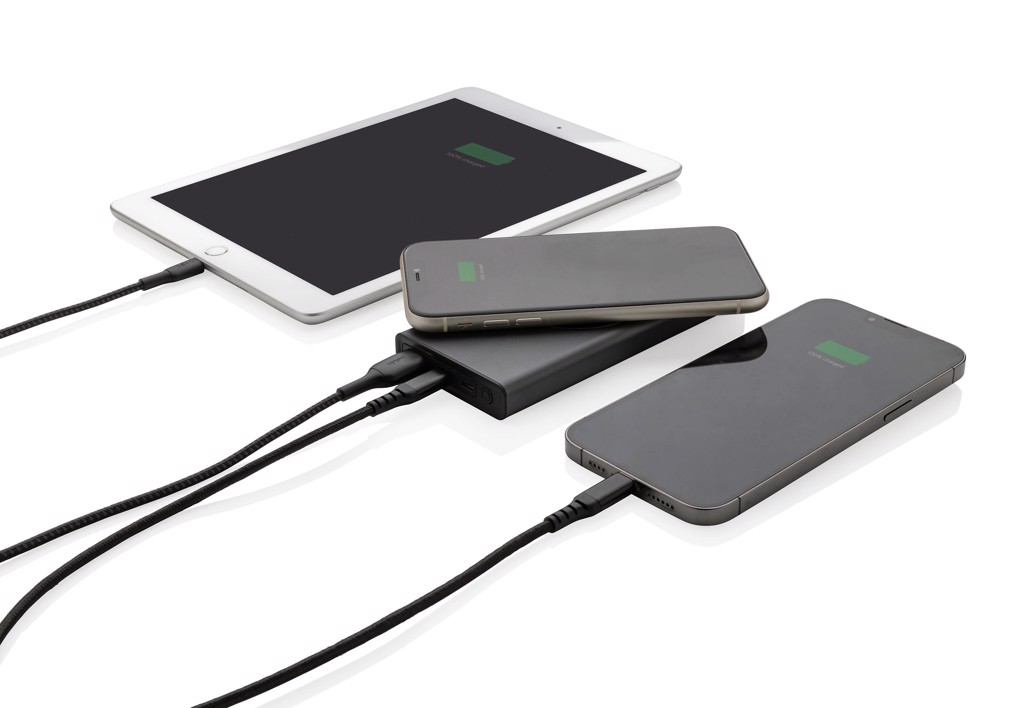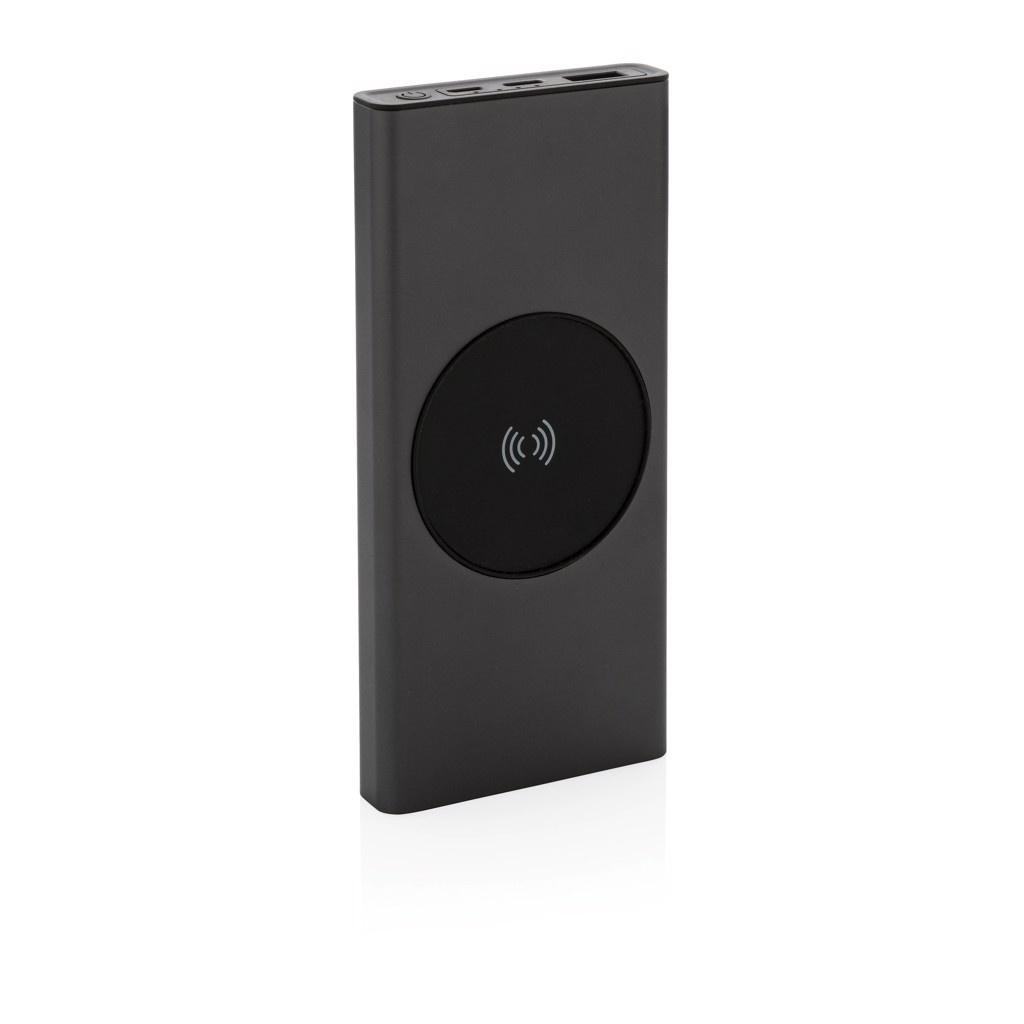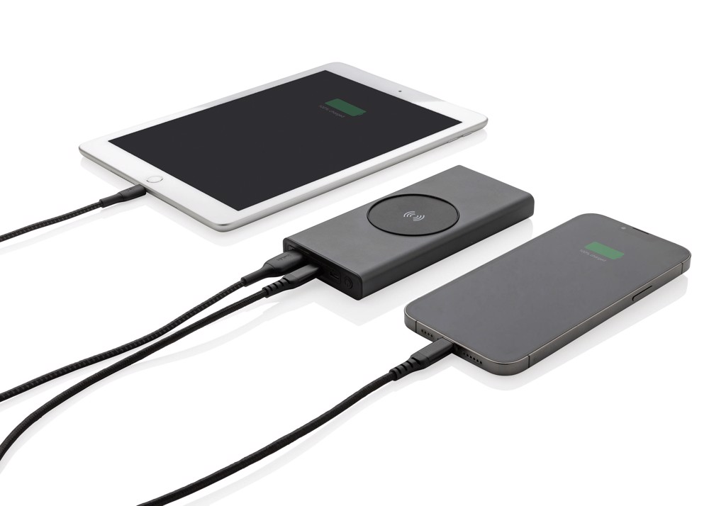 Ultra-fast charging powerbank made with RCS (Recycled Claim Standard) certified recycled aluminium and ABS. Total recycled content: 28% based on total item weight. RCS certification ensures a completely certified supply chain of the recycled materials. Aluminium does not lose its characteristics in the recycling process and can be recycled endlessly. The powerbank contains a long-lasting grade A 10.000 mAh lithium polymer battery. The C output port supports fast charging up to 18W and also fast re-charging within 3 hours. The wireless charger supports wireless charging up to 10W. The power indicators will indicate the remaining energy level so you always know when to re-charge. Item and accessories 100% PVC free. Including type C charging cable made from RCS certified recycled aluminium, TPE and PET. Packed in FSC® mix packaging. USB output 5/3A, 9V/2A. 12V/1.5A. Type C output: 5V/3A, 9V/2A, 12V/1.5A. Type C input: 5V/3A, 9V/2A, 12V/1.5A. Micro USB input: 5V/2A, 9V/2A, 12V/1.5A.
