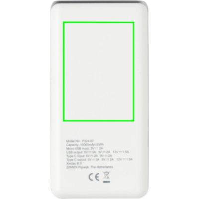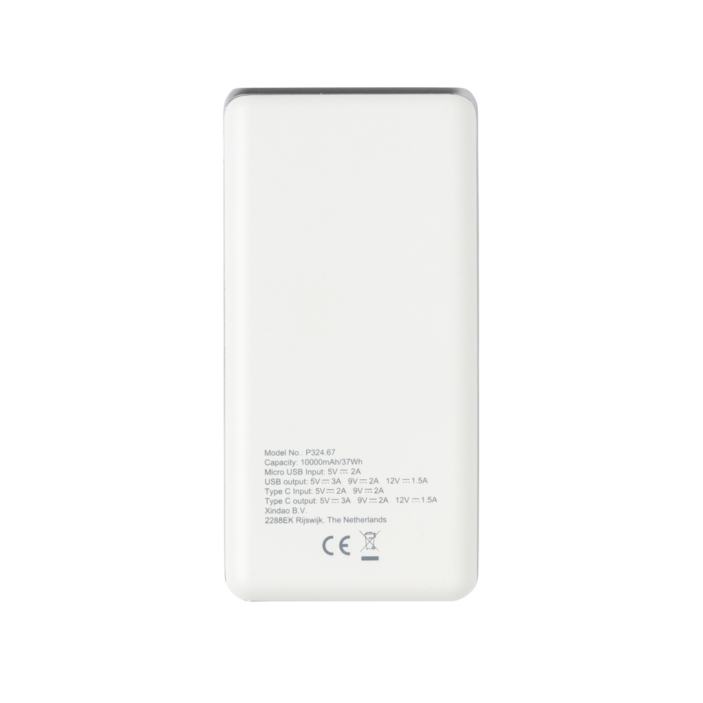 State of the art 10.000 mAh powerbank that offers the fastest charging experience available. Made out of ABS. With type C port that supports power delivery for iPhone and Macbook(max 18W) and regular USB port. Micro USB Input: 5V/2A. USB output: 5V/3A 9V/2A 12V/1.5A. Type C input: 5V/2A 9V/2A. Type C output: 5V/3A 9V/2A 12V/1.5A.