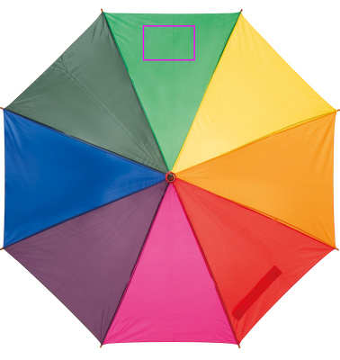 Attractive, multicolor automatic umbrella with curved wooden handle. We print your logo on a segment.