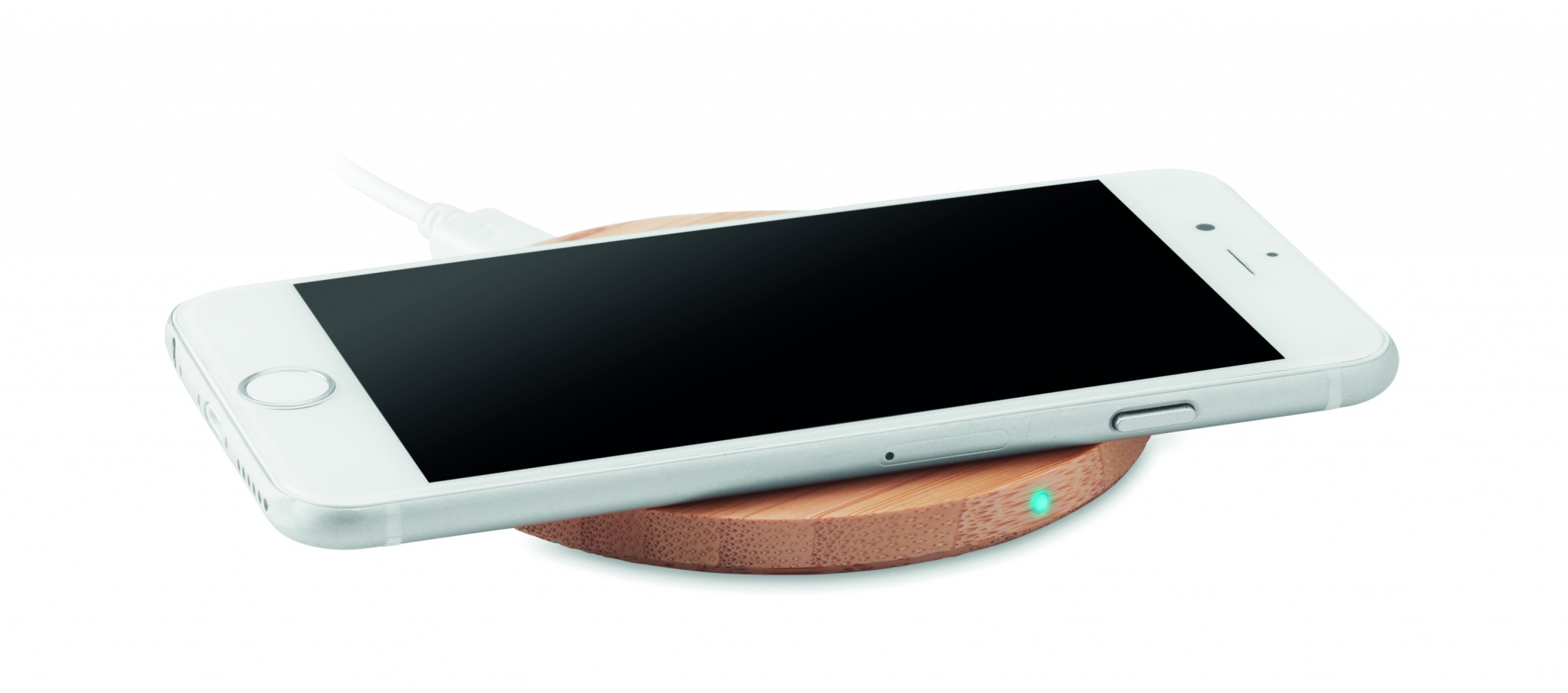 Wireless charger in bamboo. Connect device to your computer, place smartphone on it and allow it to charge. Blue light lit when charging. Output: DC9V/1.1A (10W). Compatible with all QI enabled devices such as latest Androids, iPhone® 8 and newer. Bamboo is a natural product, there may be slight variations in colour and size per item, which can affect the final decoration outcome.