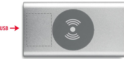 Wireless aluminium charging power bank with 4000 mAh capacity. Includes Type C connector. Output: DC5V/0.8A. Compatible latest androids, iPhone® 8, 8S and X and newer.