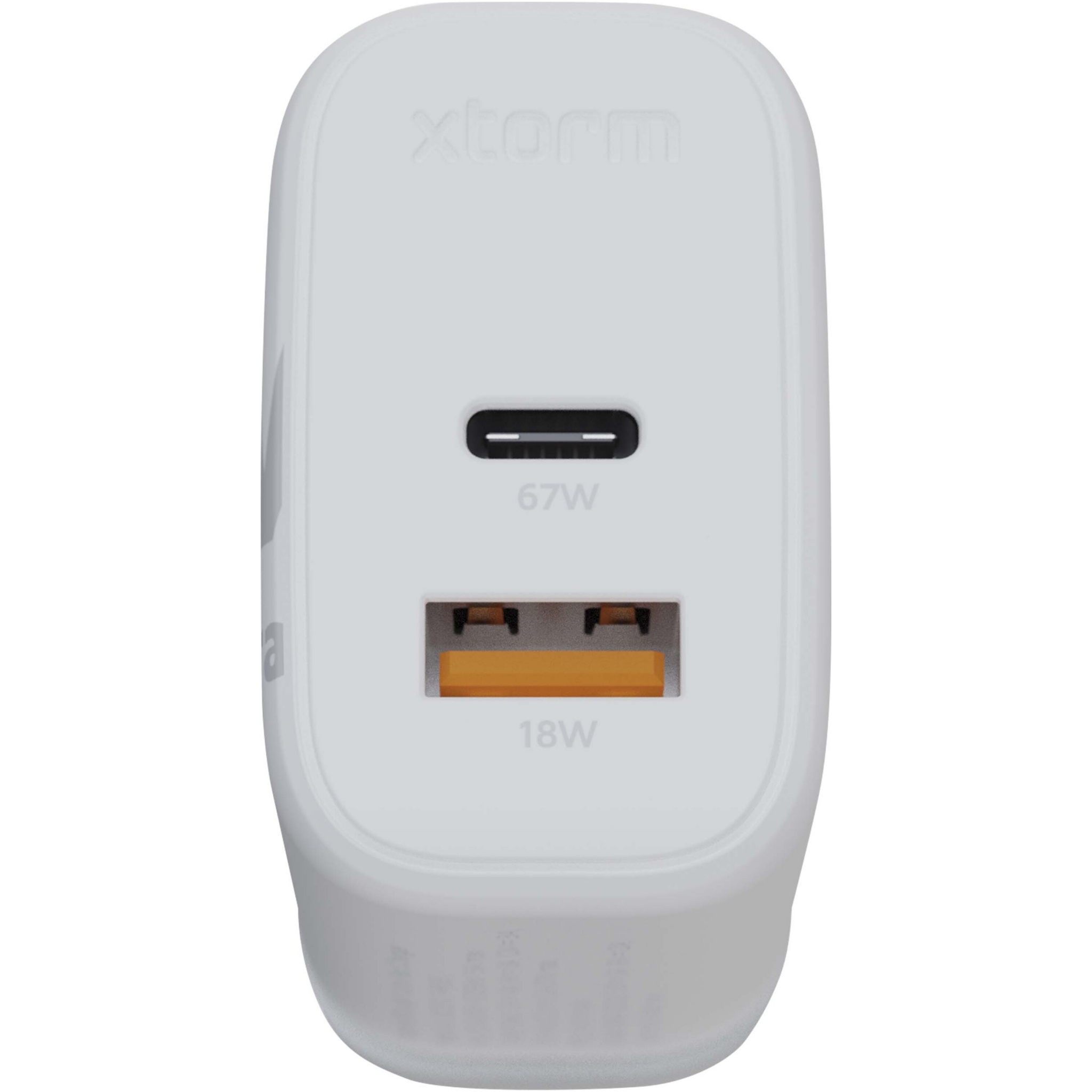 The 67W GaN² Ultra wall charger with UK plug is designed to be more compact and powerful than ever before. With its compact design and dual-port functionality, this wall charger is perfect for your travels, office, or home. To reduce waste and contribute to a more sustainable future, the charger is made from 97% recycled plastic. Output: 1 USB-C 67W power delivery, and 1 USB-A 18W quick charge. Delivered with a user manual.