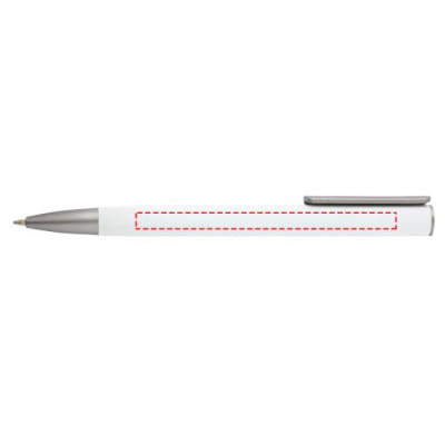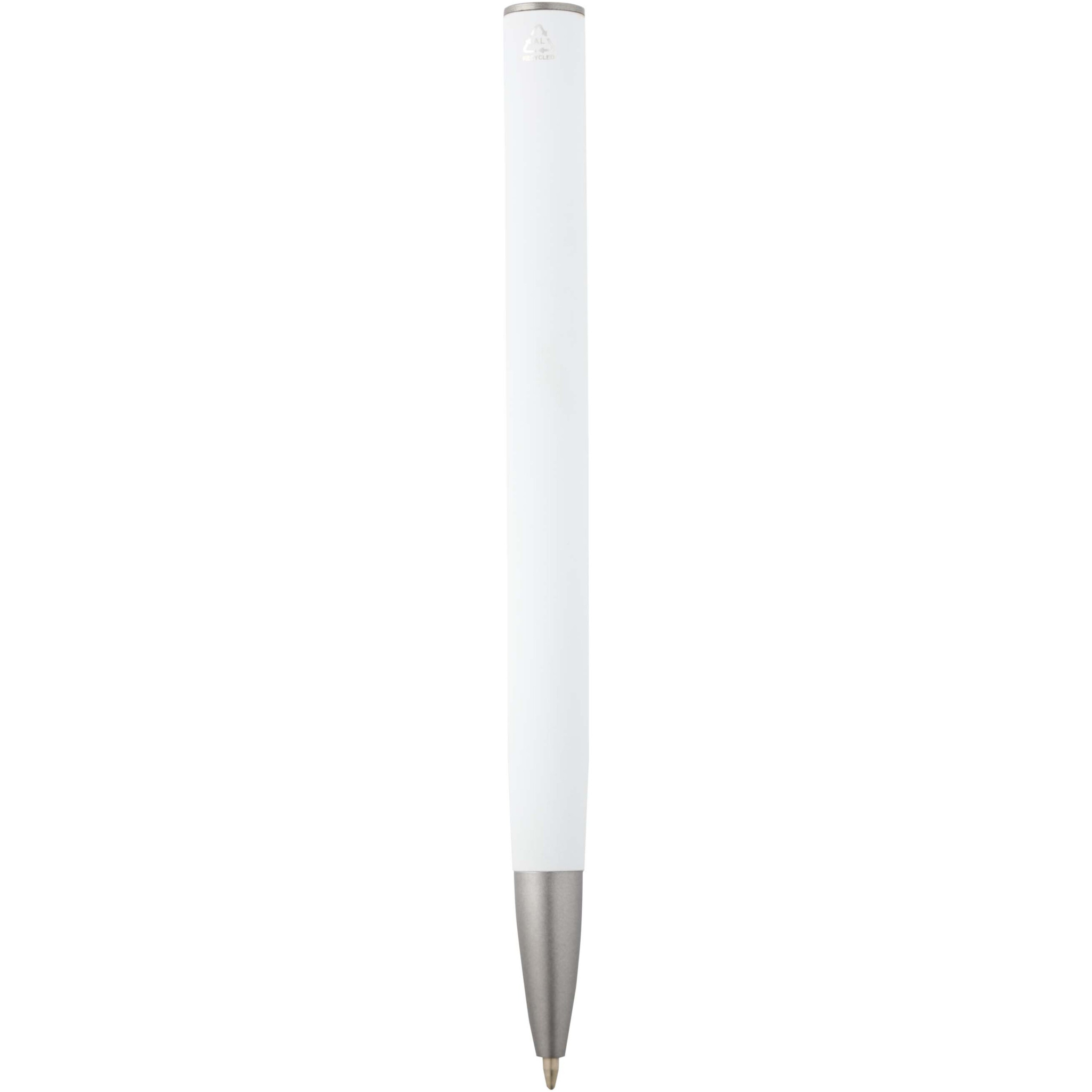 Ballpoint pen with a barrel made of recycled aluminium and a silver coated clip made of ABS plastic. Ink colour: Blue. Writing length: 800 metres. Nib size: 1.0 mm.
