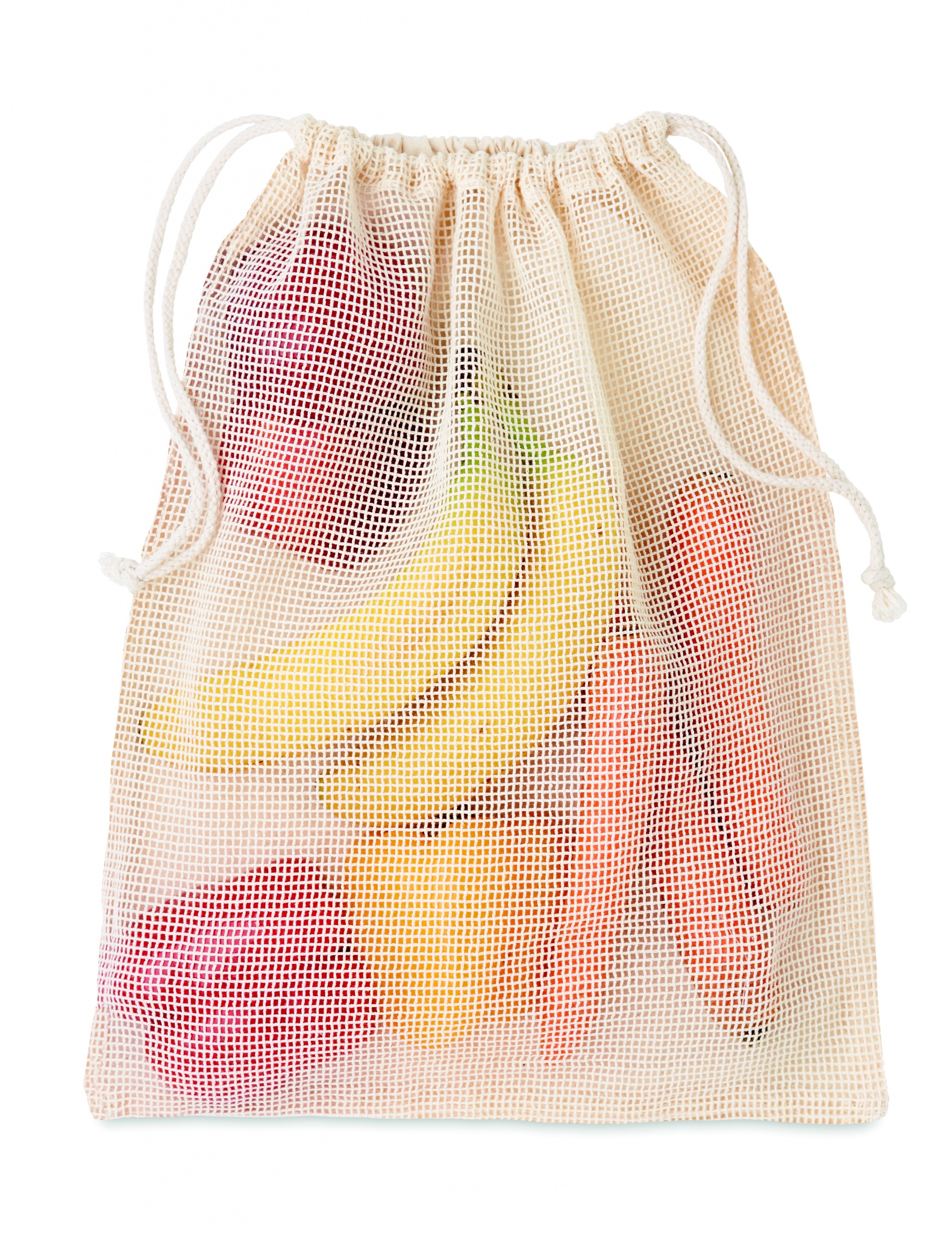 Korduvkasutatav toidukott. Üks pool on puuvillast (140gr/m²) ja teine võrkpuuvillast (110gr/m²). Pingutusnööriga sulgemine.