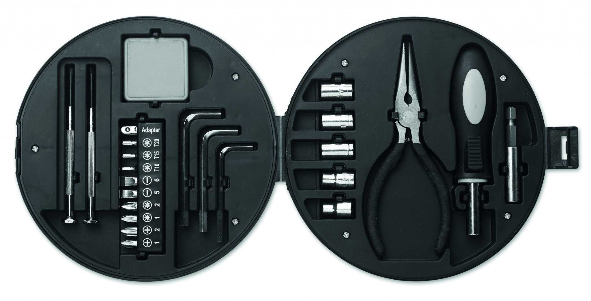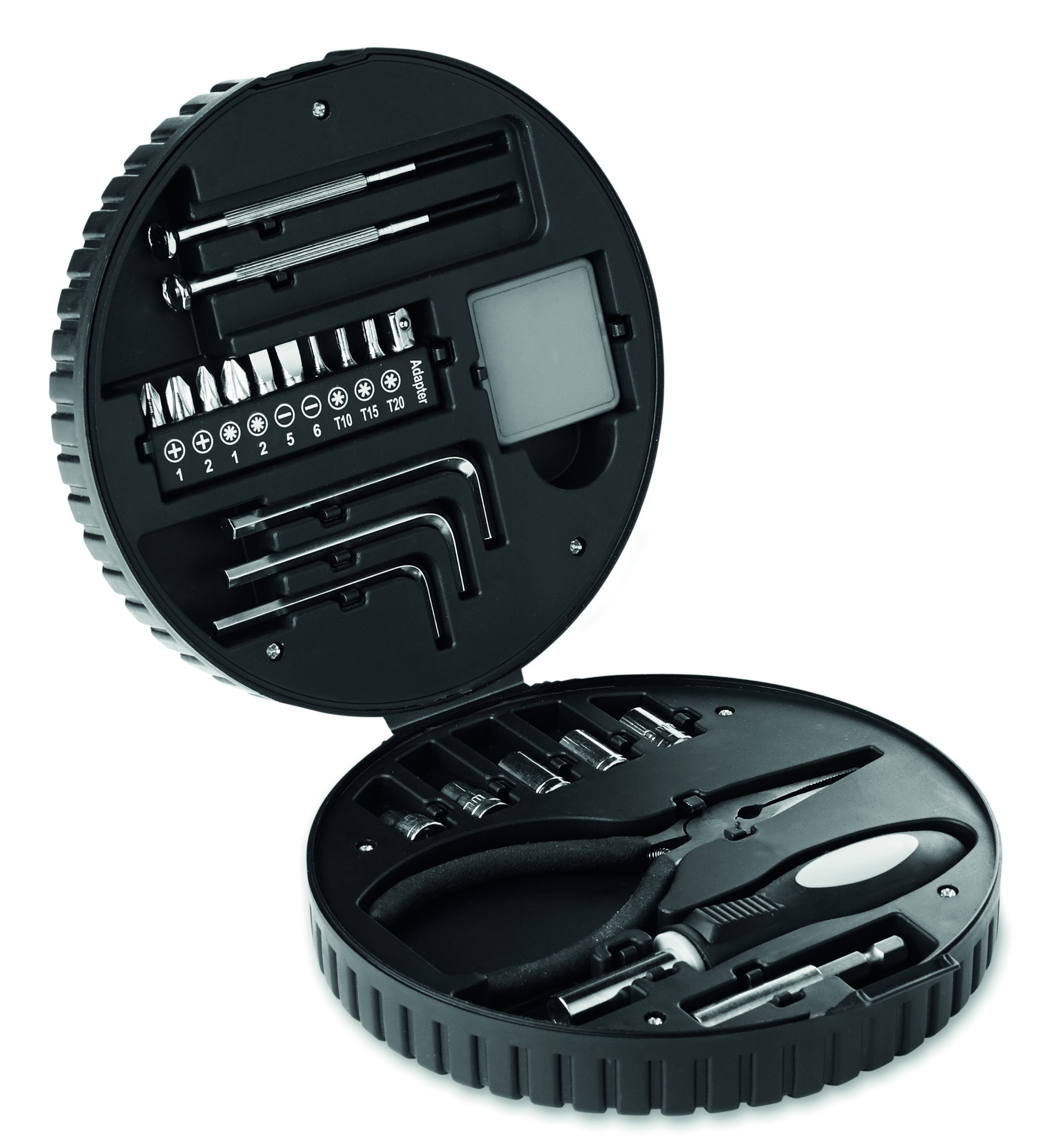 25-osaline tööriistakomplekt rehvikujulises karbis, mis sisaldab 1 pikendust, 1 pesakruvikeeraja, 1 ninatang, 5 pesa, 3 kuuskantvõtit, 10 otsiku komplekti, 2 täppiskruvikeerajat ja 1 teipi.