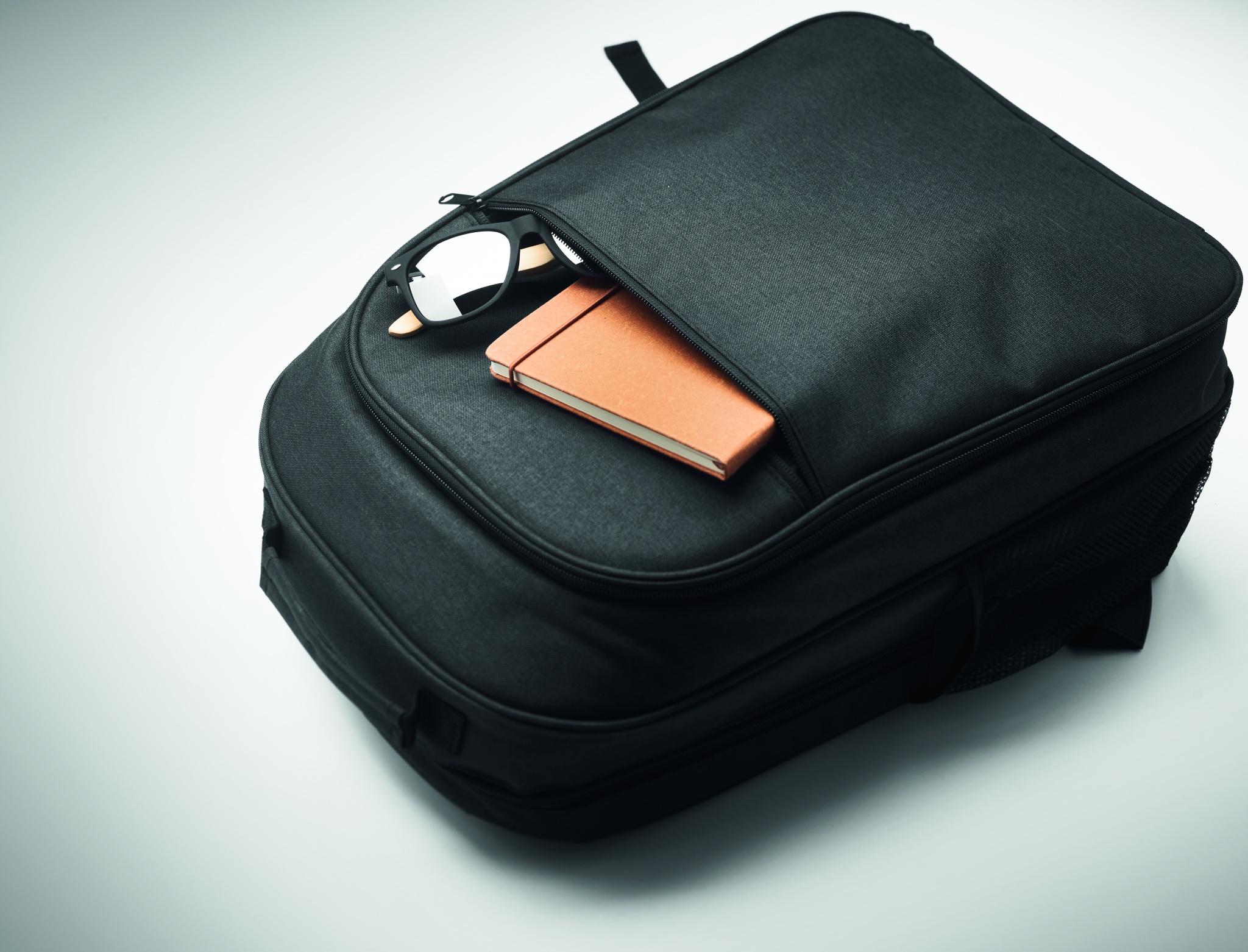 300D RPET jahutusseljakott 15-tollise sülearvuti sahtliga. Ees lukuga tasku ja üks külgmine võrksahtel.