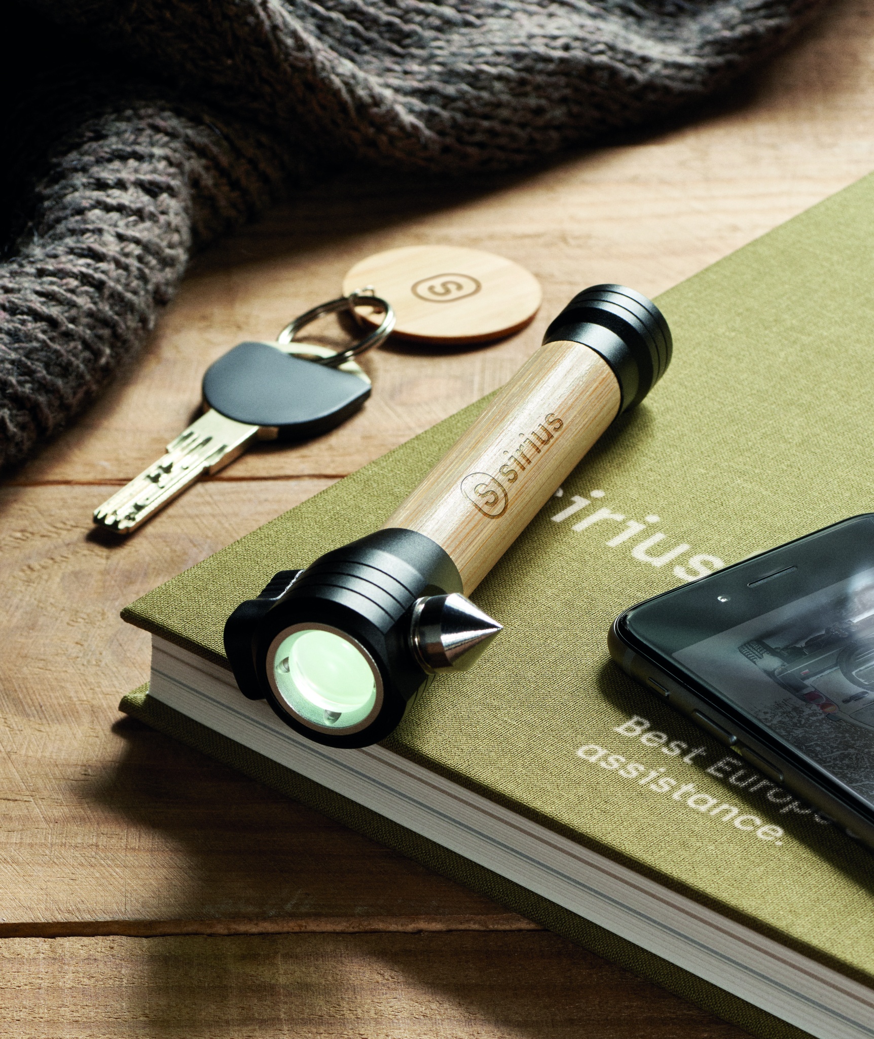 Logotrade ärikingi foto: 3-ühes bambusest taskulamp koos avariivasara ja turvavöölõikuriga
