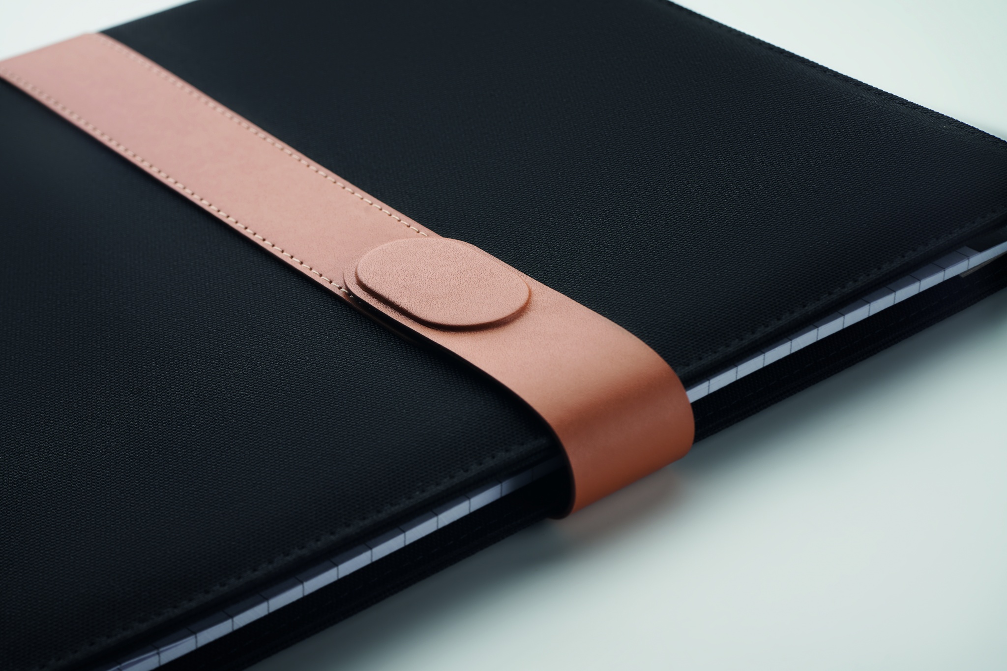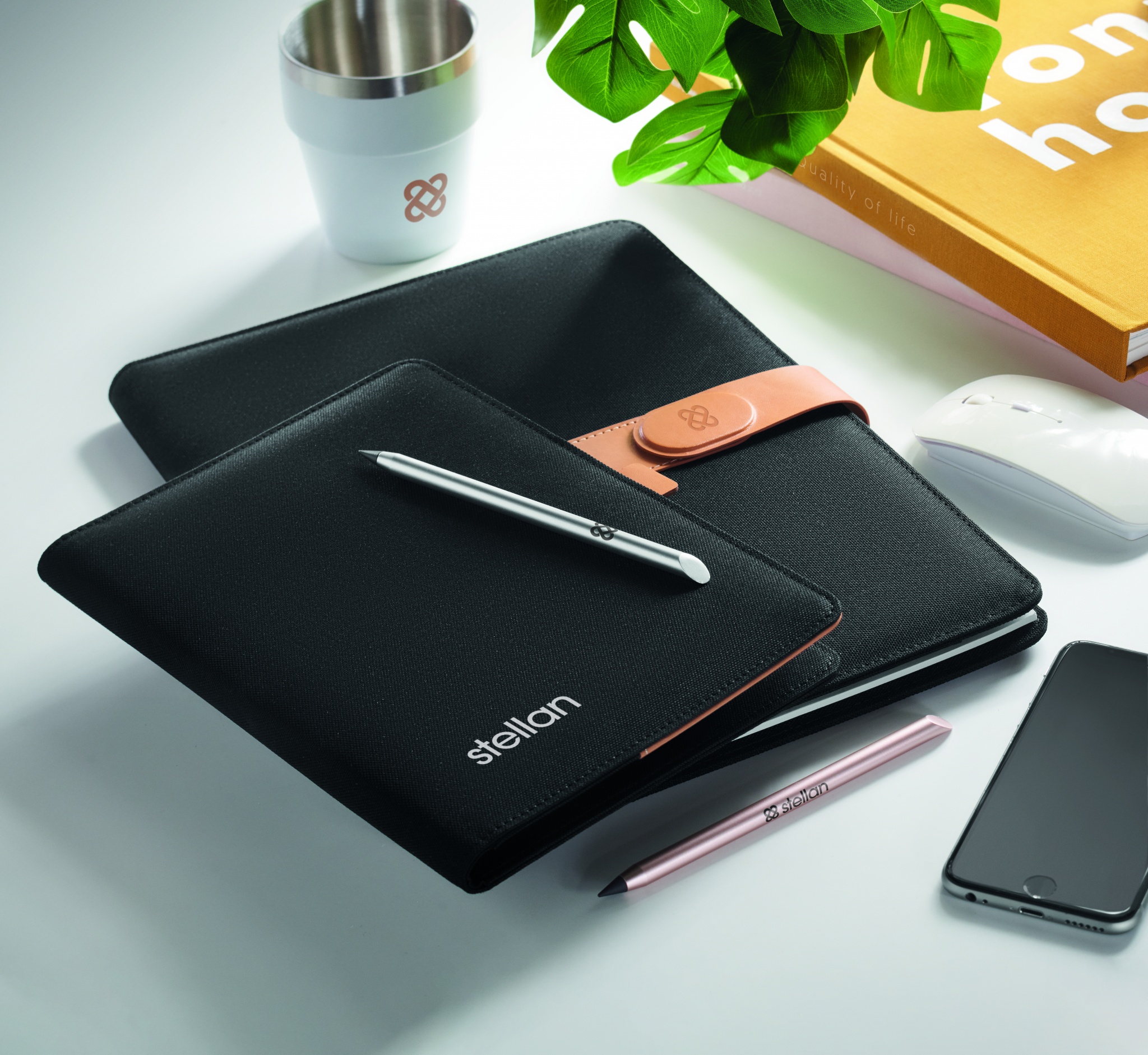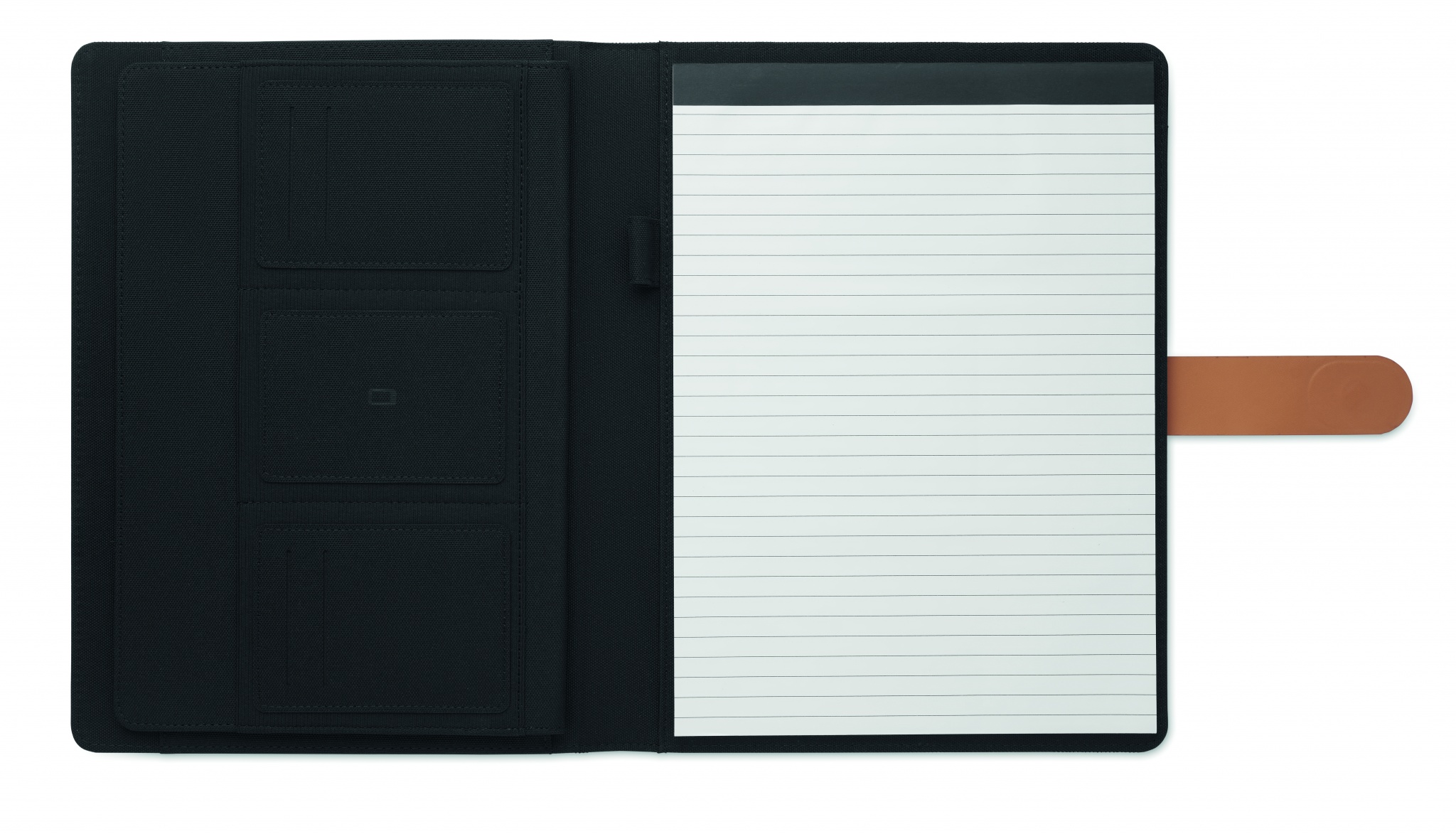 A4 portfell kunstnahast detailidega RPET. Vahetatav A4 märkmik.30 taaskasutatud paberist vooderdatud lehte. Pliiatsihoidja. 4 kaardihoidjat, 3 väikest taskut ja üks suur sahtel. Magnetrihmaga sulgur.
