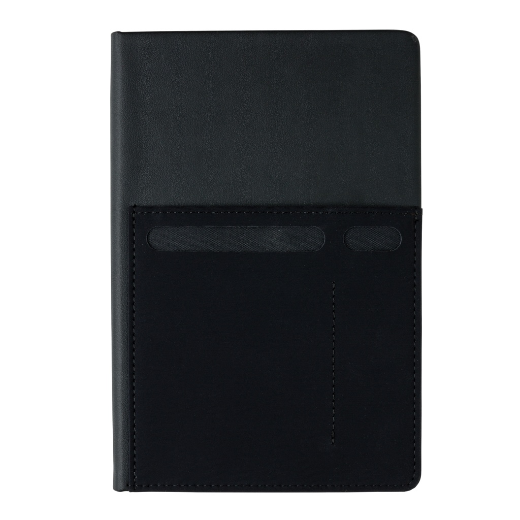 A5 märkmik, mille sees on 160 kreemikat joonitud lehte 80g/m2 paberist. Esikaanel on elastne telefonitasku, pliiatsitasku ja suurem varruktasku dokumentide jaoks. Telefonitasku on 8 cm lai, mis sobib iPhone 7 plussiga.