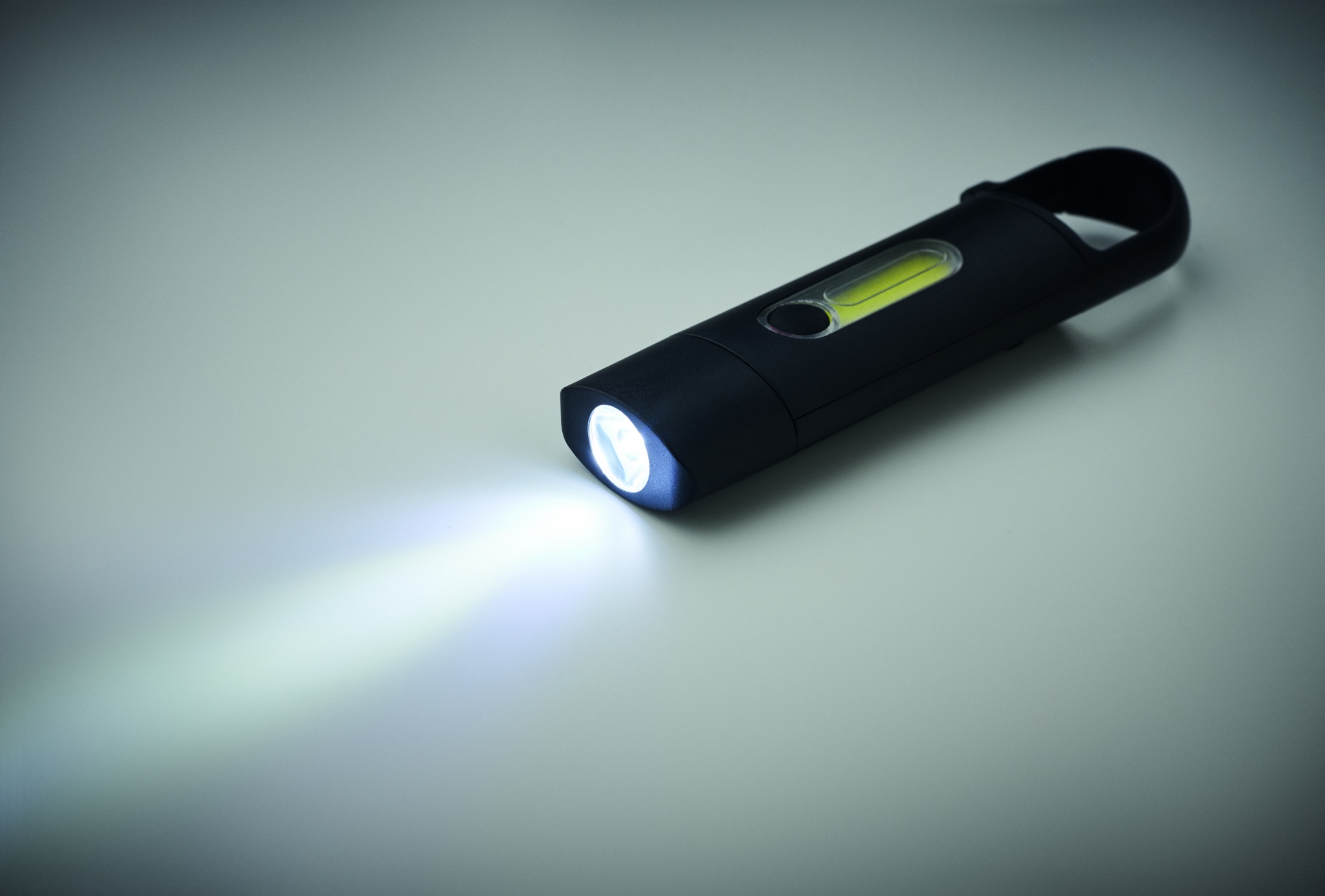 Taskusuurune taaslaetav COB-välklamp ABS-karabiinhaagiga. Hädavalgustus ja 3 valgustusrežiimi. 1 × 3,7 V, 200 mAh taaslaetav liitiumaku (kaasas, ei ole vahetatav).