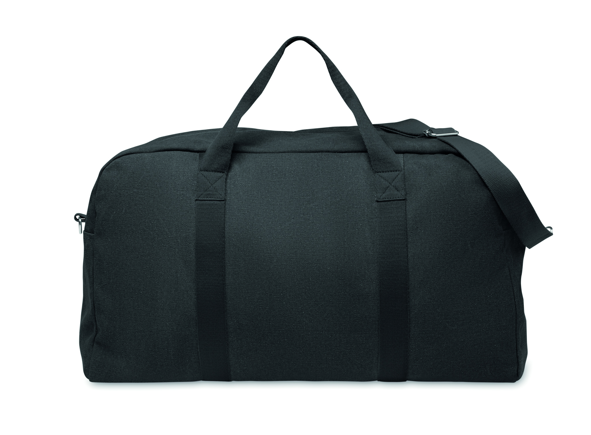 Must taaskasutatud 450 gr/m² kangast (60% taaskasutatud puuvill ja 40% taaskasutatud polüester) reisikott reguleeritava ja eemaldatava puuvillase rihmaga.