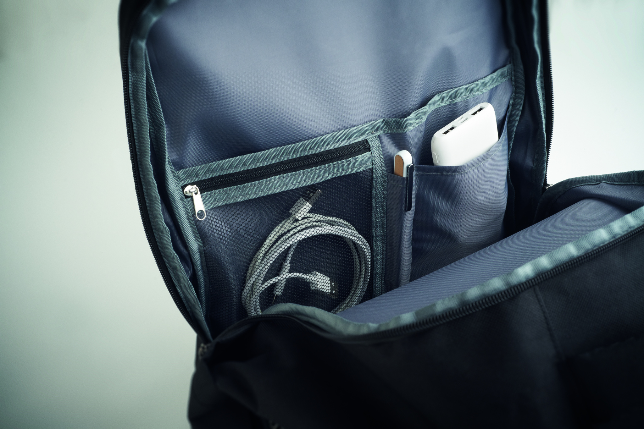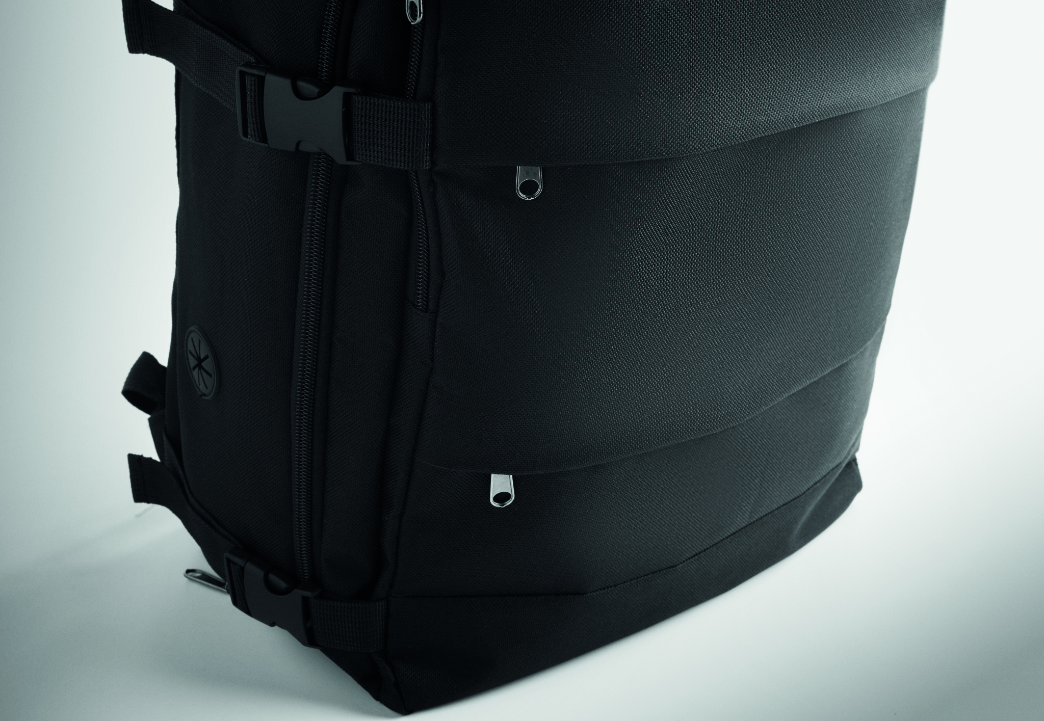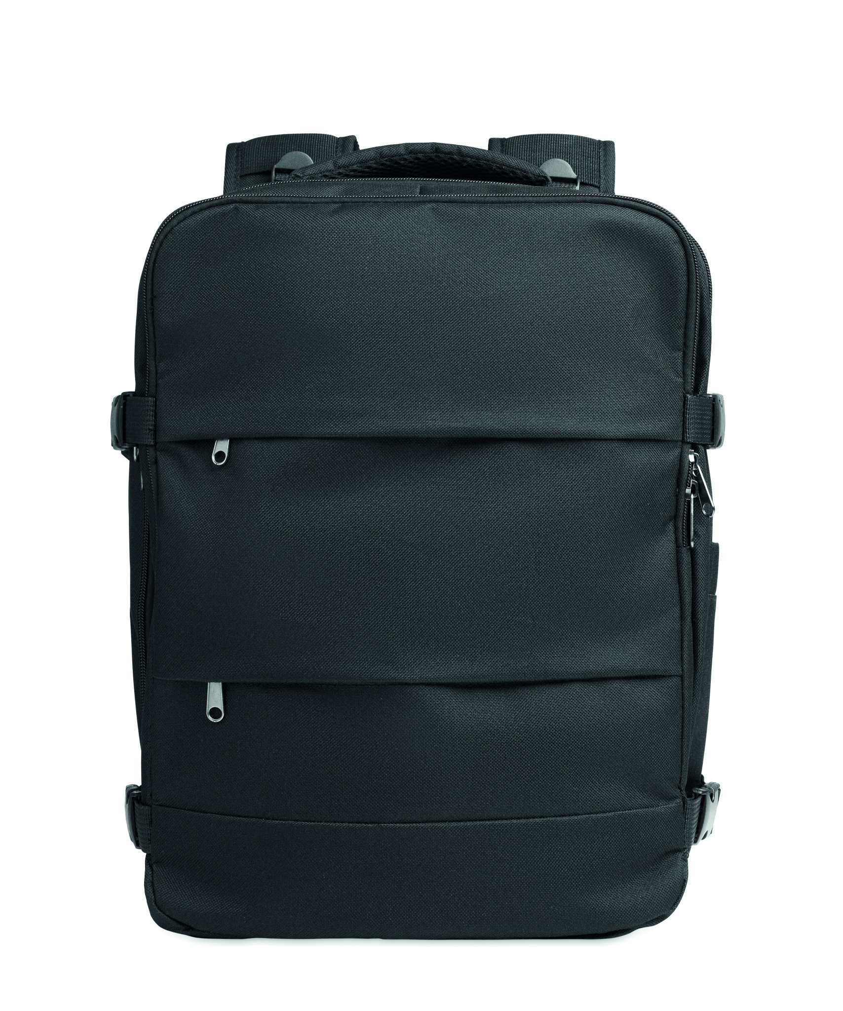 Salongimõõdus pikendatav seljakott 600D RPET polüestrist PU-tagusega ja 180° avausega. Sisaldab jalanõude vaheseina, polsterdatud 15-tollist sülearvutitaskut, võrgust rihmasid, pagasirihma ja külgmisi pandlaid.