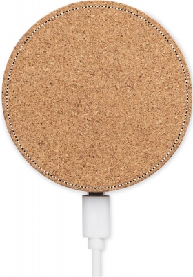 Ümara kujuga korgist juhtmevaba laadija. Väljund: DC 9V/1.1A (10W). Ühildub iPhone® 8 ja uuematega. Kork on 100% looduslik materjal. Selle struktuurse olemuse ja pinna poorsuse tõttu võib lõpptulemus eseme kohta esineda kõrvalekaldeid.