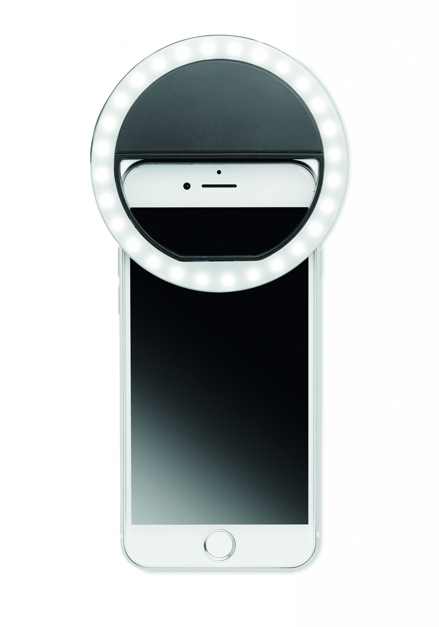 8 cm kaasaskantav ABS-materjalist selfie-rõngavalgusti 28 LED-iga. Valge valgus reguleeritav 3 erineva heleduse tasemeni. USB taaslaetav 80 mAh aku.