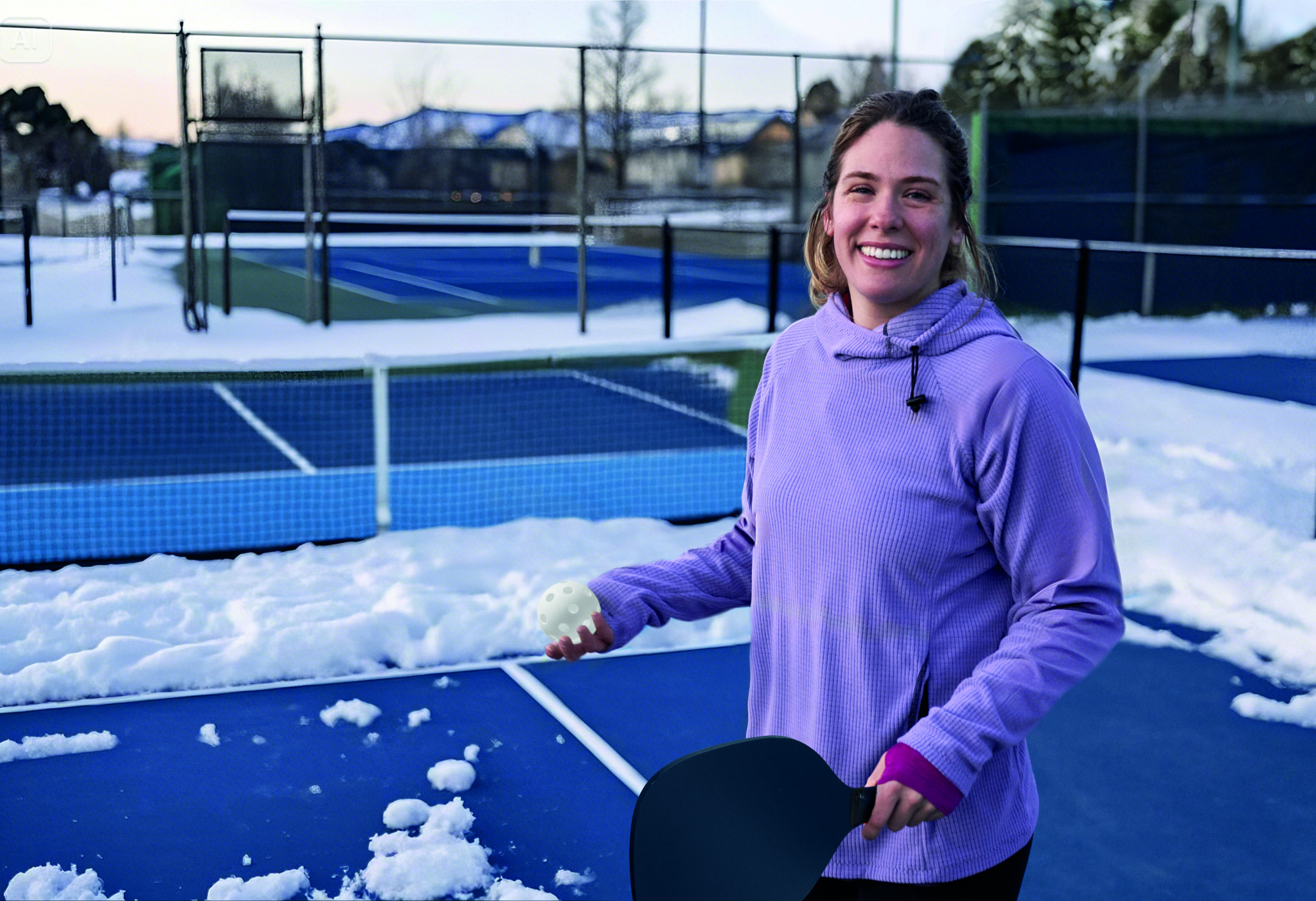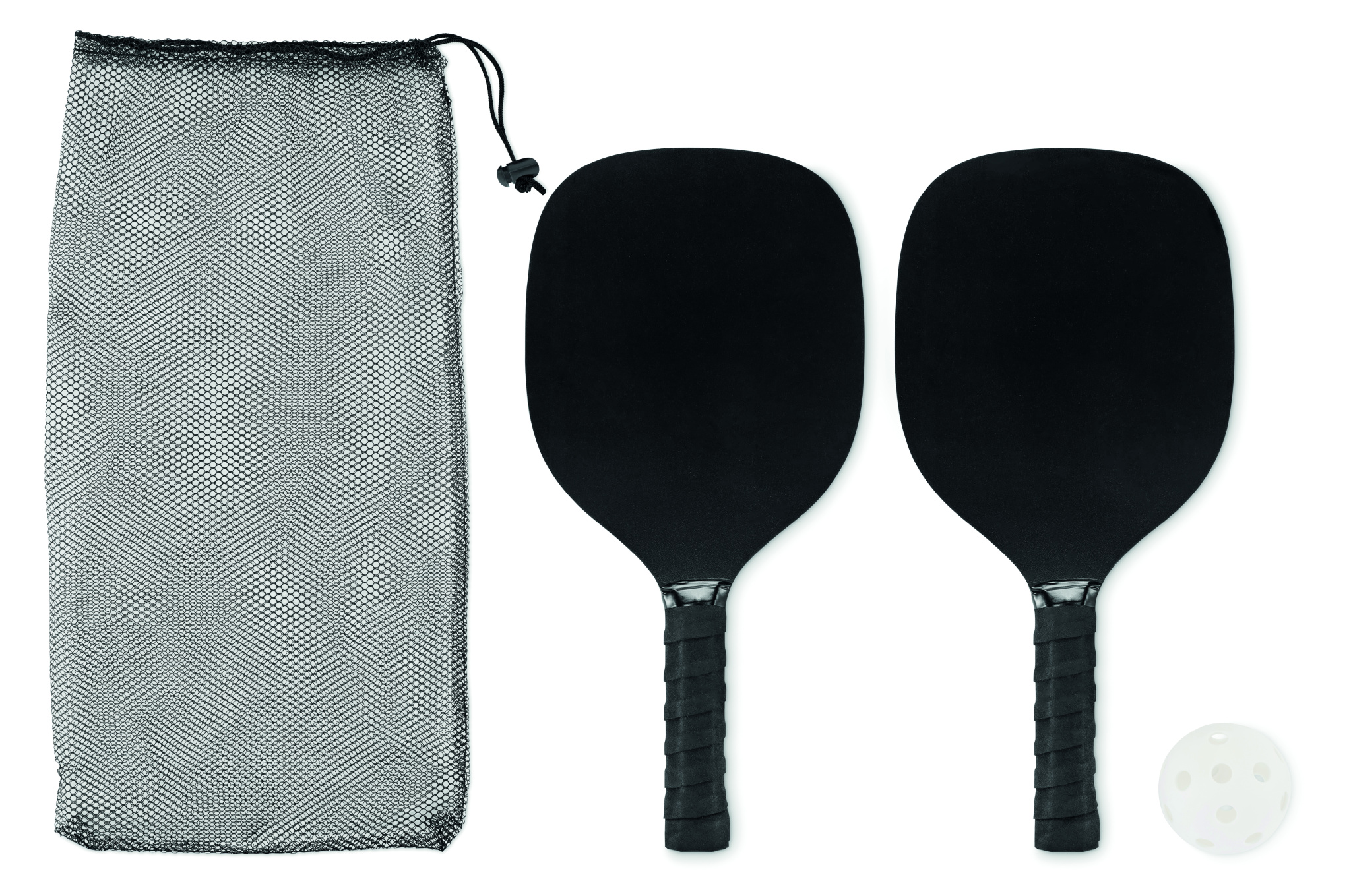 Kahe reketiga komplekt MDF-ist puidust ja ühe palliga RPET-võrgust nööriga kotis.
