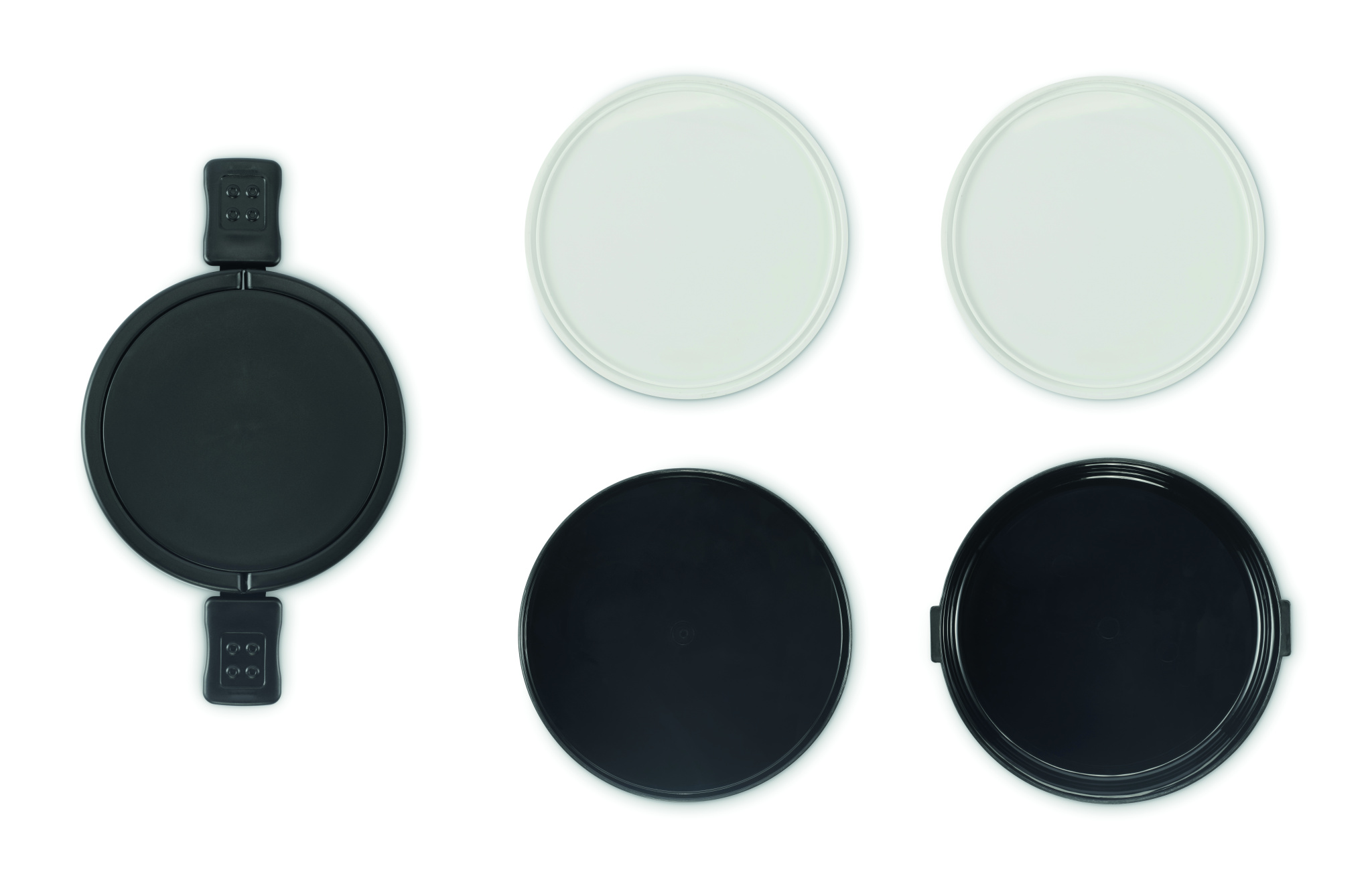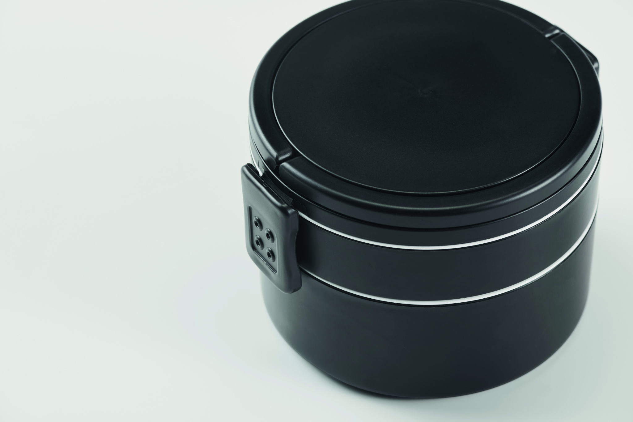 Kahetasandiline ümmargune lõunakarp PP-st, külgedelt klambriga sulguri ja käepidemetega. Komplektis kaaned. Mahutavus 250 ml ülevalt, 700 ml alt.