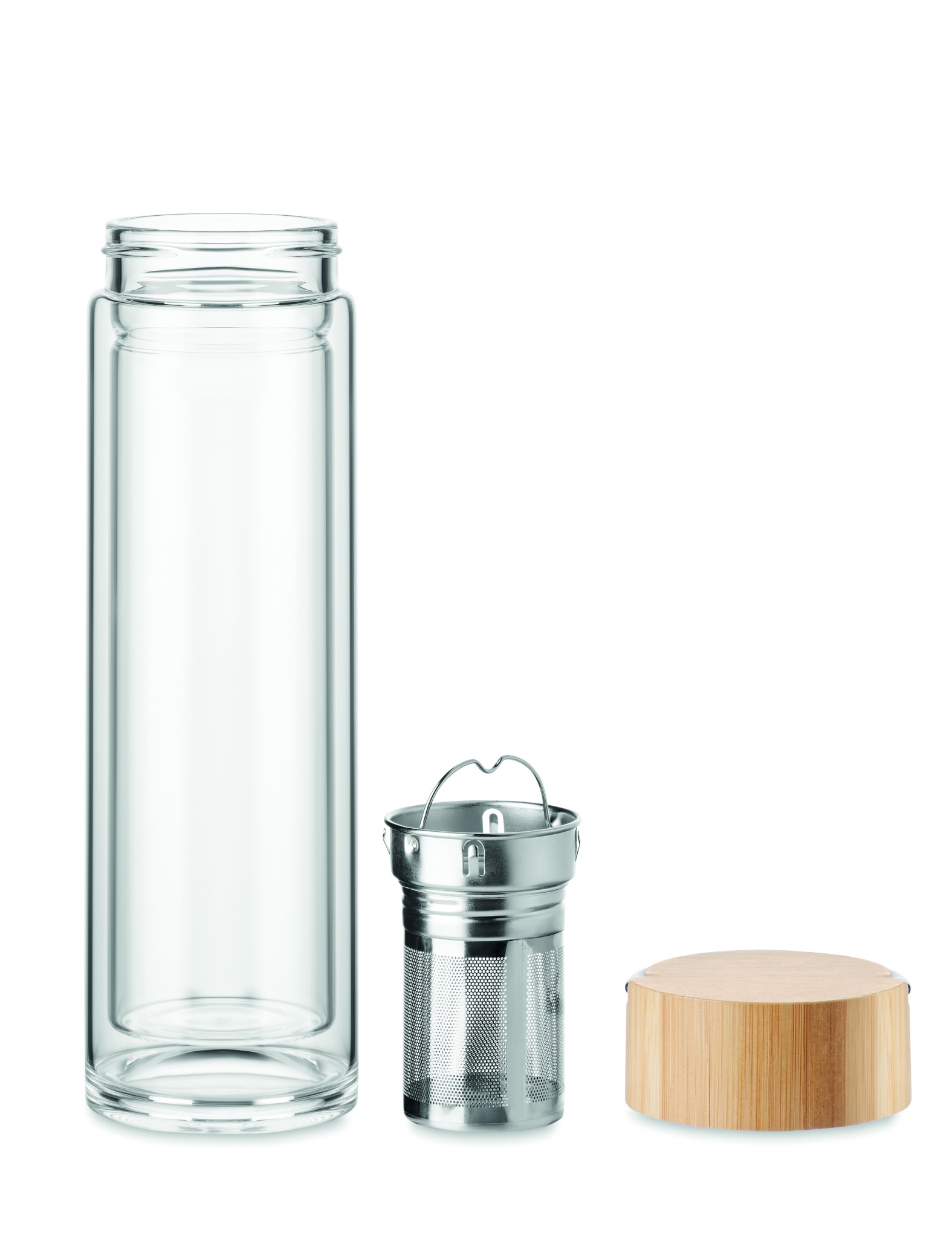 Topeltseinaga pudel kõrgest boorsilikaatklaasist ja bambusest riidepuu kaas koos teetõmmisega. Mahutavus: 400 ml. Bambus on looduslik toode, ühe eseme värvis ja suuruses võib esineda väikesi erinevusi, mis võivad mõjutada lõppviimistlust.