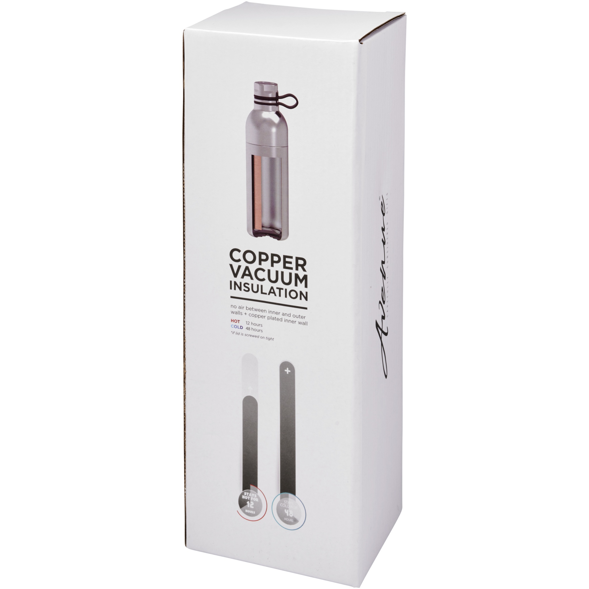 Kahekordse seinaga roostevabast terasest vaakumkonstruktsioon vase isolatsiooniga, mis võimaldab jookidel külmana püsida 48 tundi või kuumana vähemalt 12 tundi. Konstruktsioon hoiab ära ka kondenseerumise pudeli välisküljel. Sellel on keeratav pealispind ja roostevabast terasest kaas koos mugava silikoonist käsitsemisaasaga. Kahekordne avanemiskonstruktsioon lihtsaks puhastamiseks ja täitmiseks. Maht on 590 ml. Esitatakse Avenue kinkekarbis.