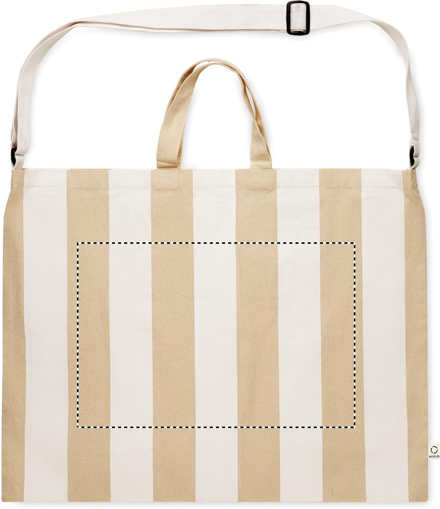 Eriti suur sisetaskuga triibuline rannakott 280 gr/m² taaskasutatud puuvillast (80%) ja taaskasutatud polüestrist (20%). Lühikesed käepidemed ja üks suur reguleeritav õlarihm.