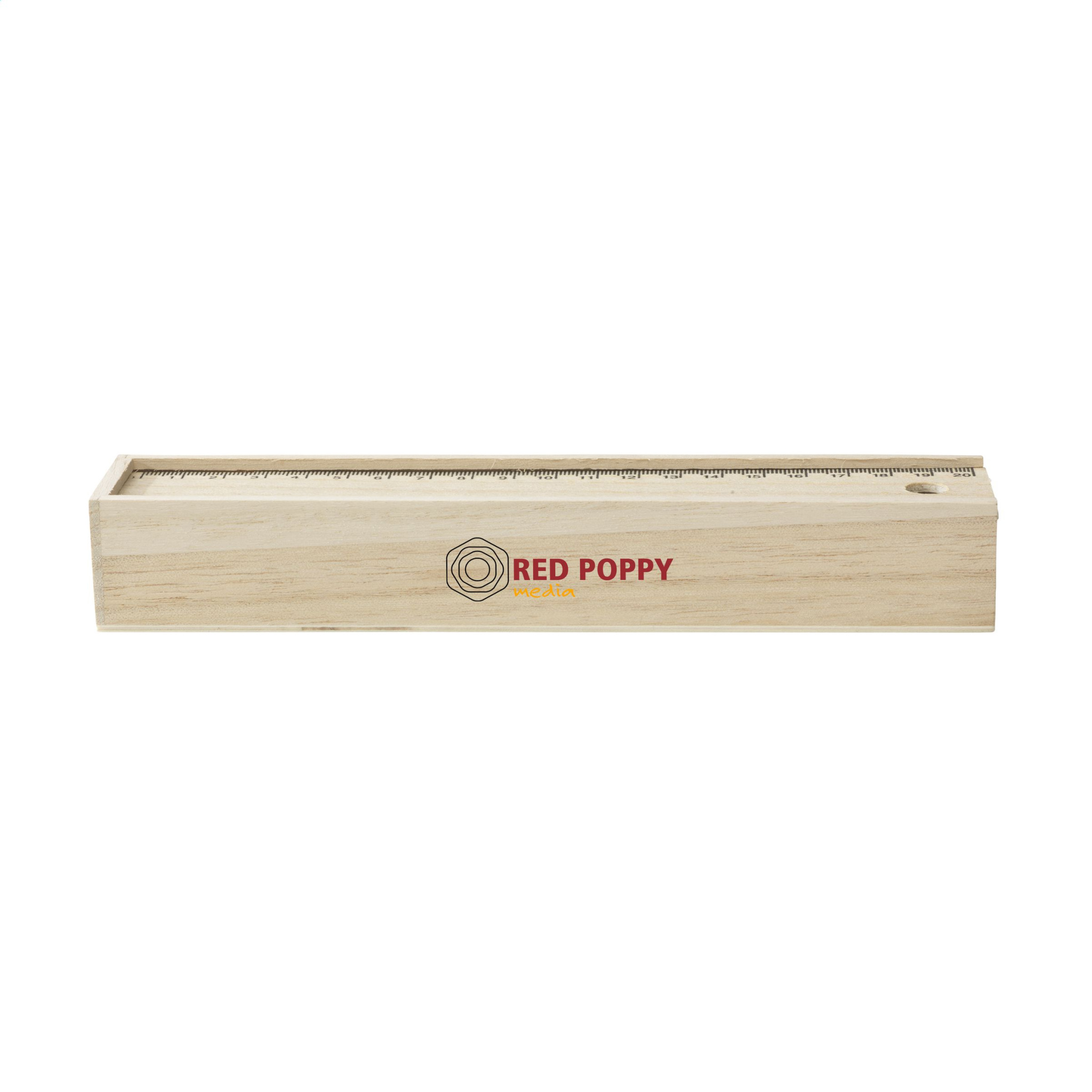 Puidust hoiukarp lükandkaanega (20 cm joonlaud), 12 teritatud, värvipliiatsit ja puidust teritaja.