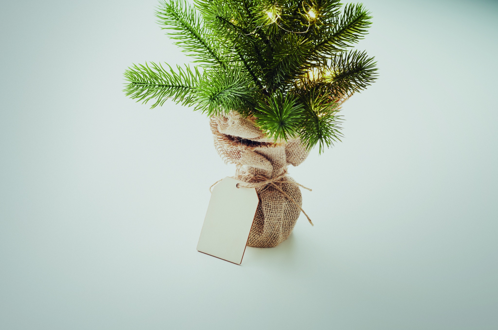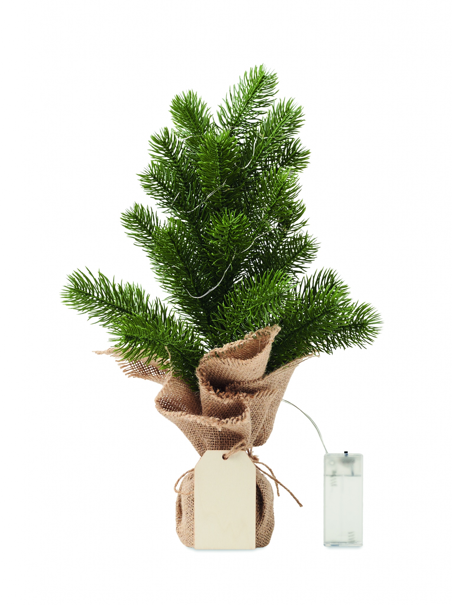 Mini kunstlik (PE) jõulupuu 20 LED soojakollase tulega džuudist alusel. Kaasas puidust kingilipik. 2 AA patareid ei sisalda.