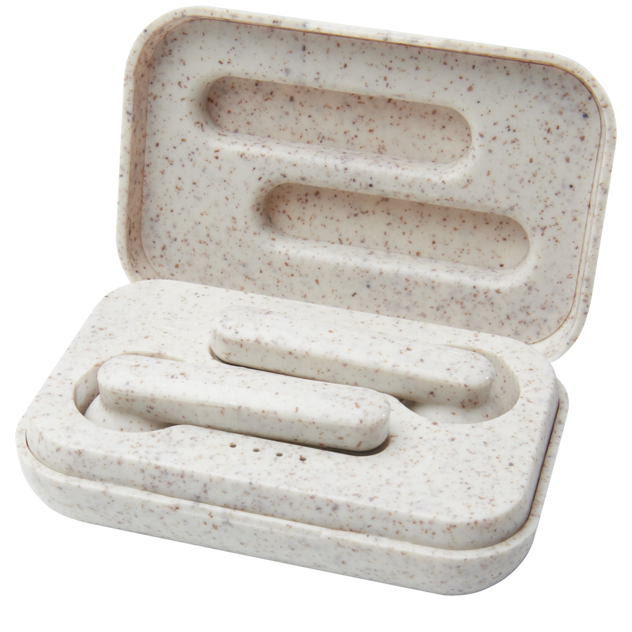 True Wireless stereokõrvaklapid, mis on valmistatud nisukõrrest plastikust, vähendades vajaliku plasti kogust. Sisseehitatud multifunktsionaalne nupp kõigi funktsioonide juhtimiseks: sisse/välja lülitamine, vastamine/kõne katkestamine, esitamine, paus, järgmine/eelmine lugu, helitugevuse suurendamine/vähendamine, hääleabi aktiveerimine. Bluetooth® 5.0 ulatusega kuni 10 meetrit. Toitekapsel suudab laadida kõrvaklappe 0 kuni 100% vähemalt 3 korda. Taasesitusaeg on maksimaalse helitugevusega kuni 2 tundi ja kõrvaklapid saab täis laadida 1 tunniga. Tarnitakse kinkekarbis koos kasutusjuhendiga (mõlemad säästvast materjalist).