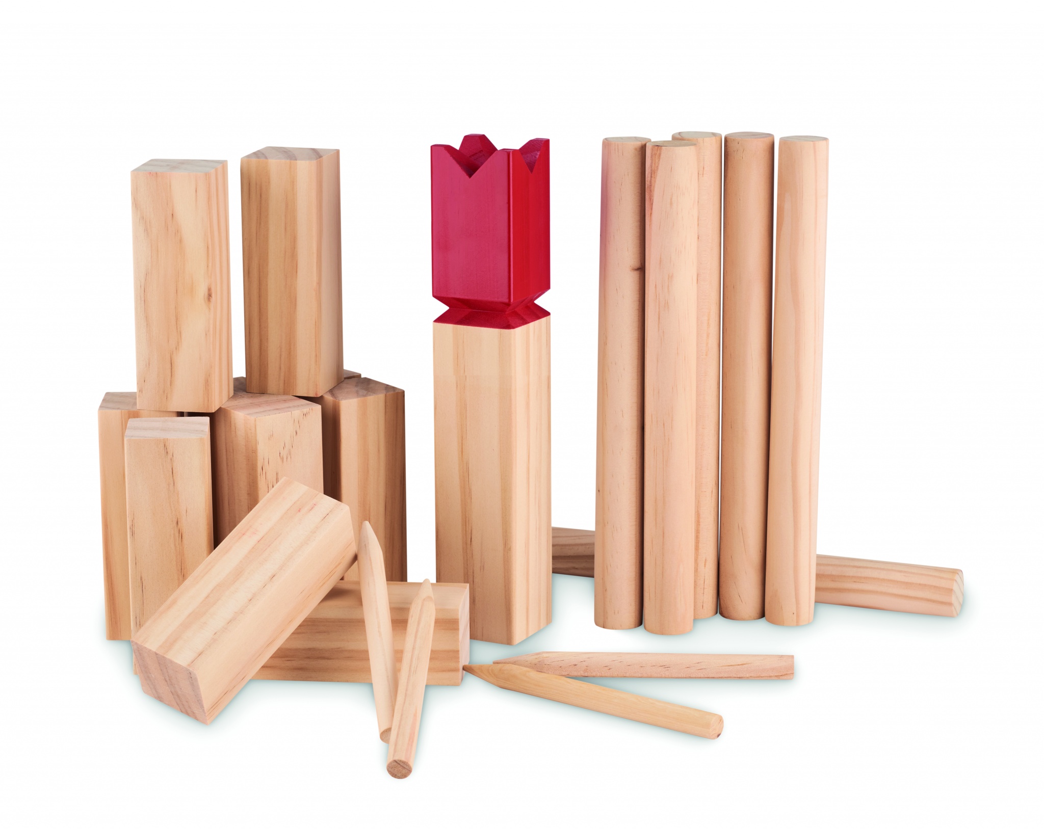 Männipuidust viskemäng puuvillases nöörikotis. Sisaldab 10 tk lühikest ruudukujulist pulka, 4 tk teravat pulka, 6 tk ümmargust pulka ja 1 tk King pulka.
