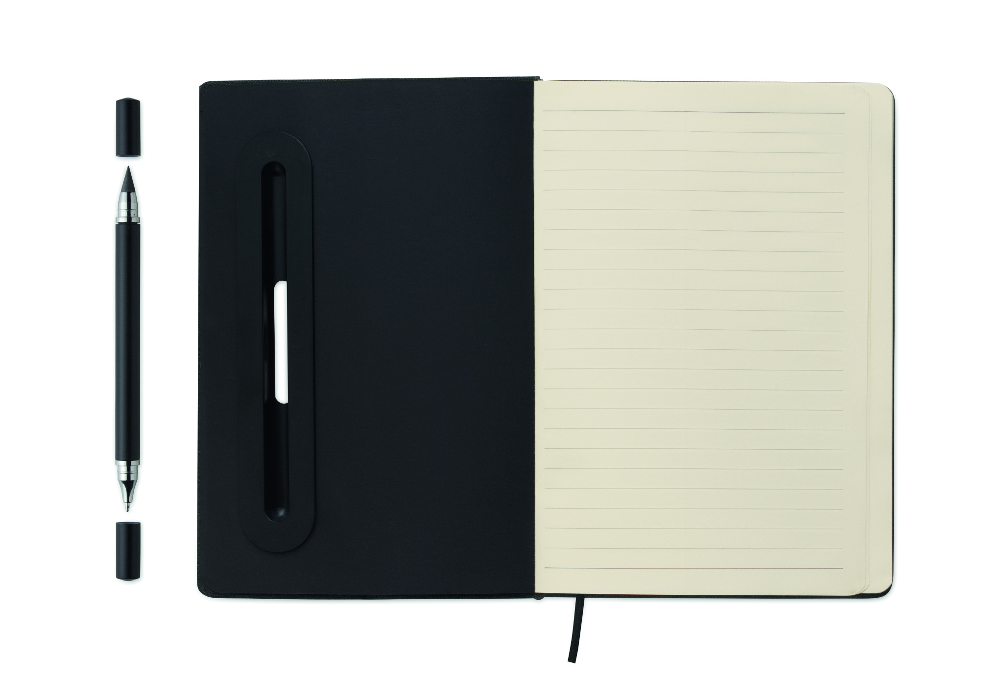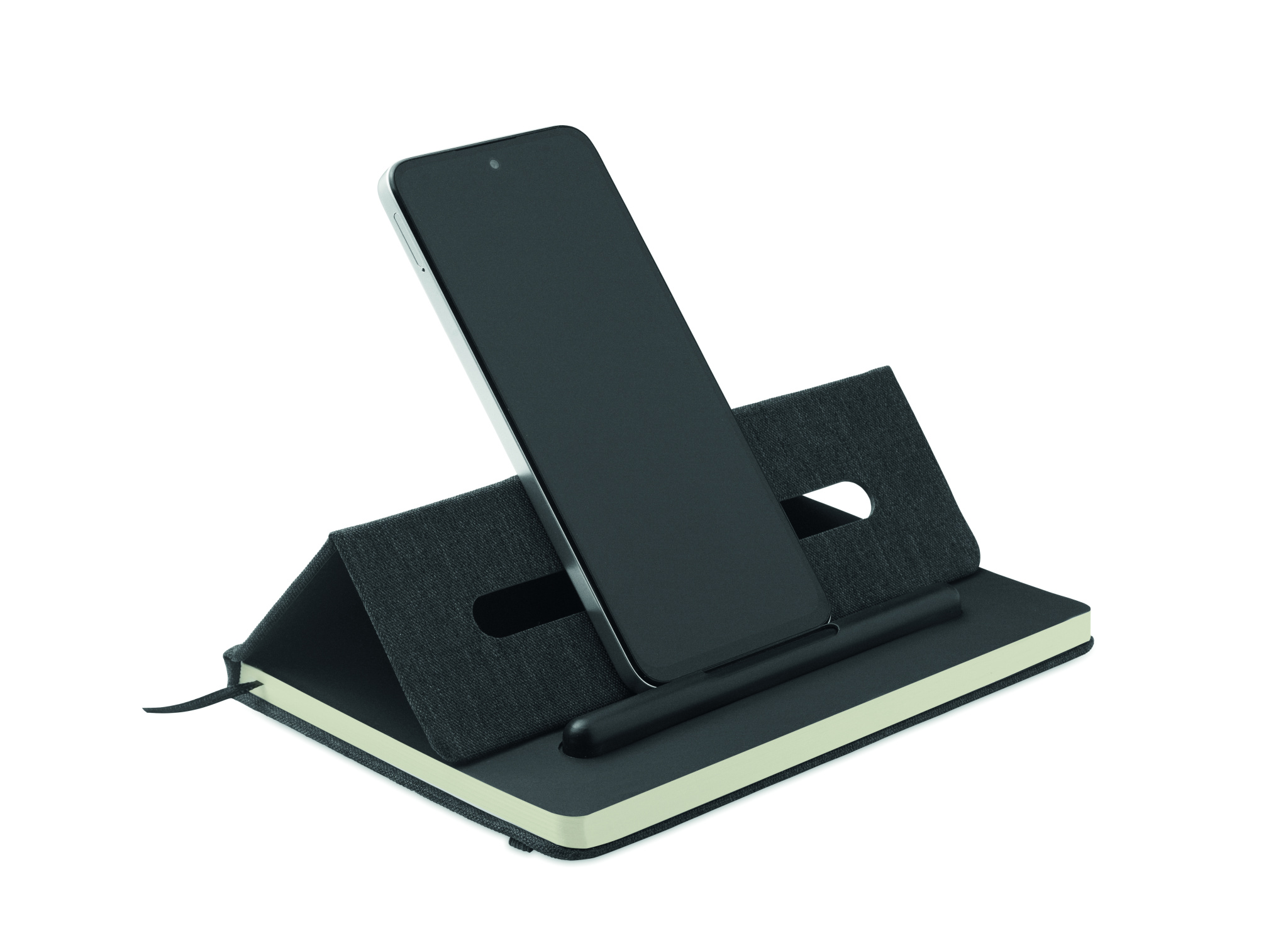 A5 märkmik RPET kõvade kaantega, millel on telefonihoidiku funktsioon. 2-ühes tindivaba ja tavaline ABS- pastapliiats. 192 taaskasutatud paberist lehekülge (96 lehte). Samas toonis kummipaela ja järjehoidjaga.