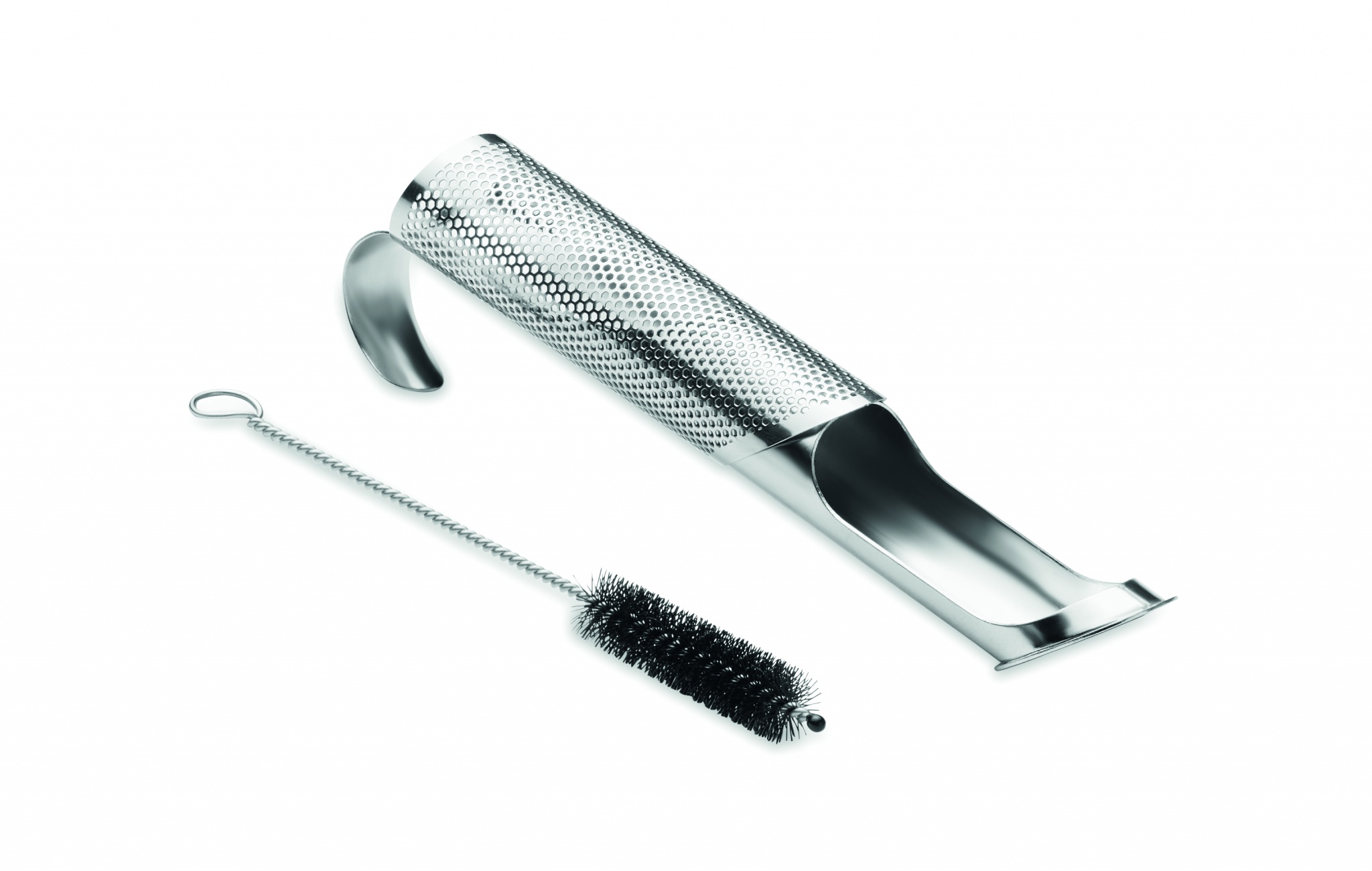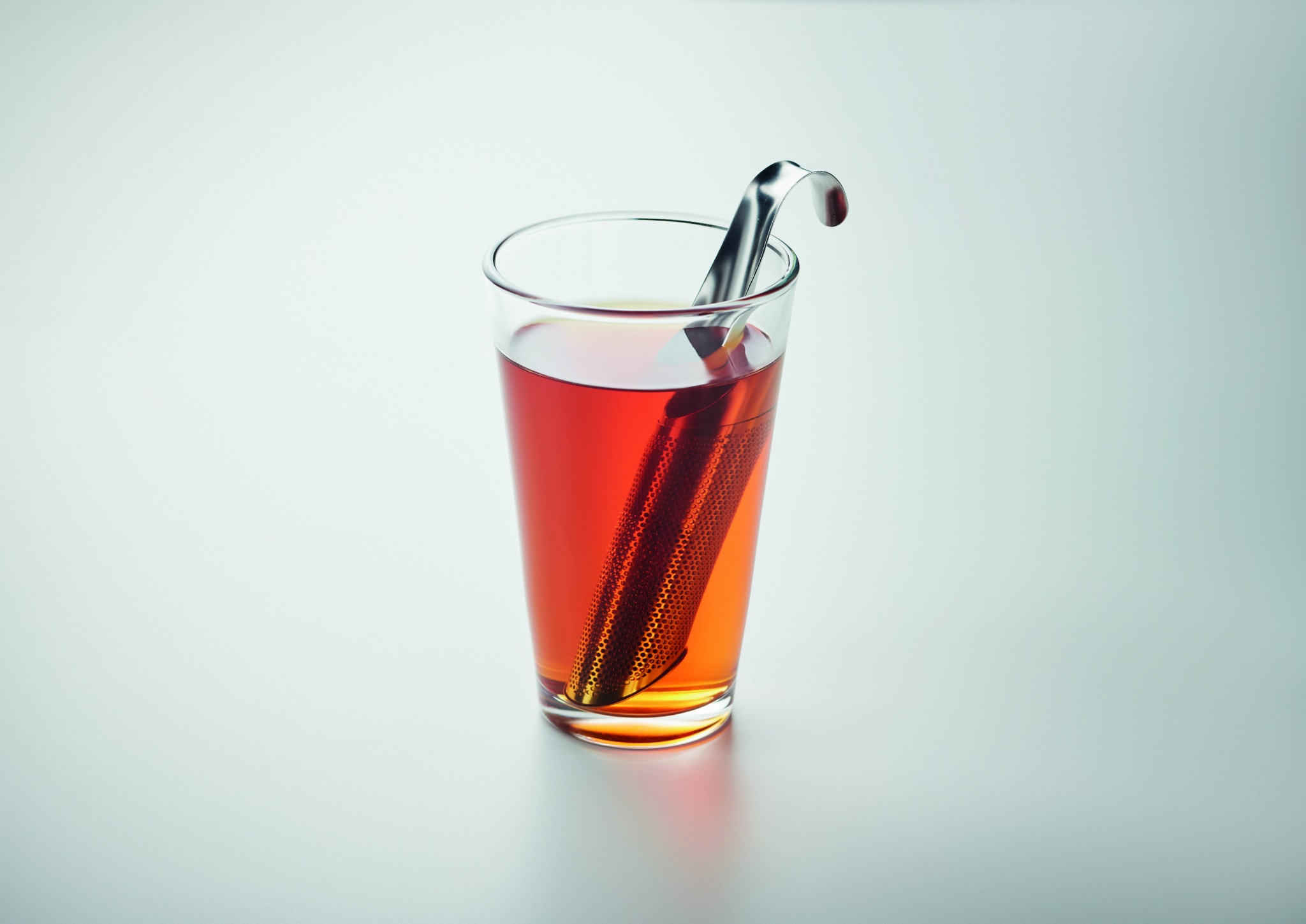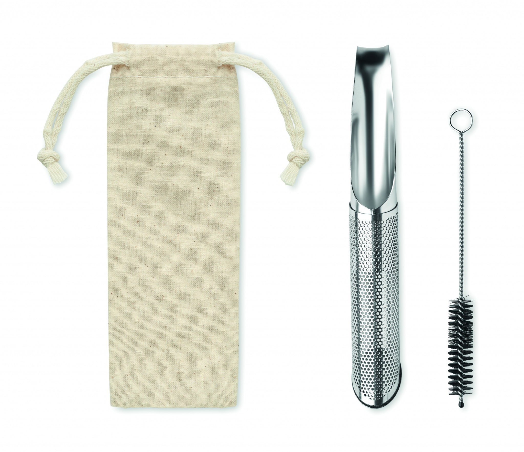 Korduvkasutatav roostevabast terasest torust teetõmmise komplekt puuvillases kotis. Sisaldab kompaktse ja kumera konksuga teefiltrit, mis võimaldab sellel rippuda üle tassi või kruusi serva, ja puhastusharja.