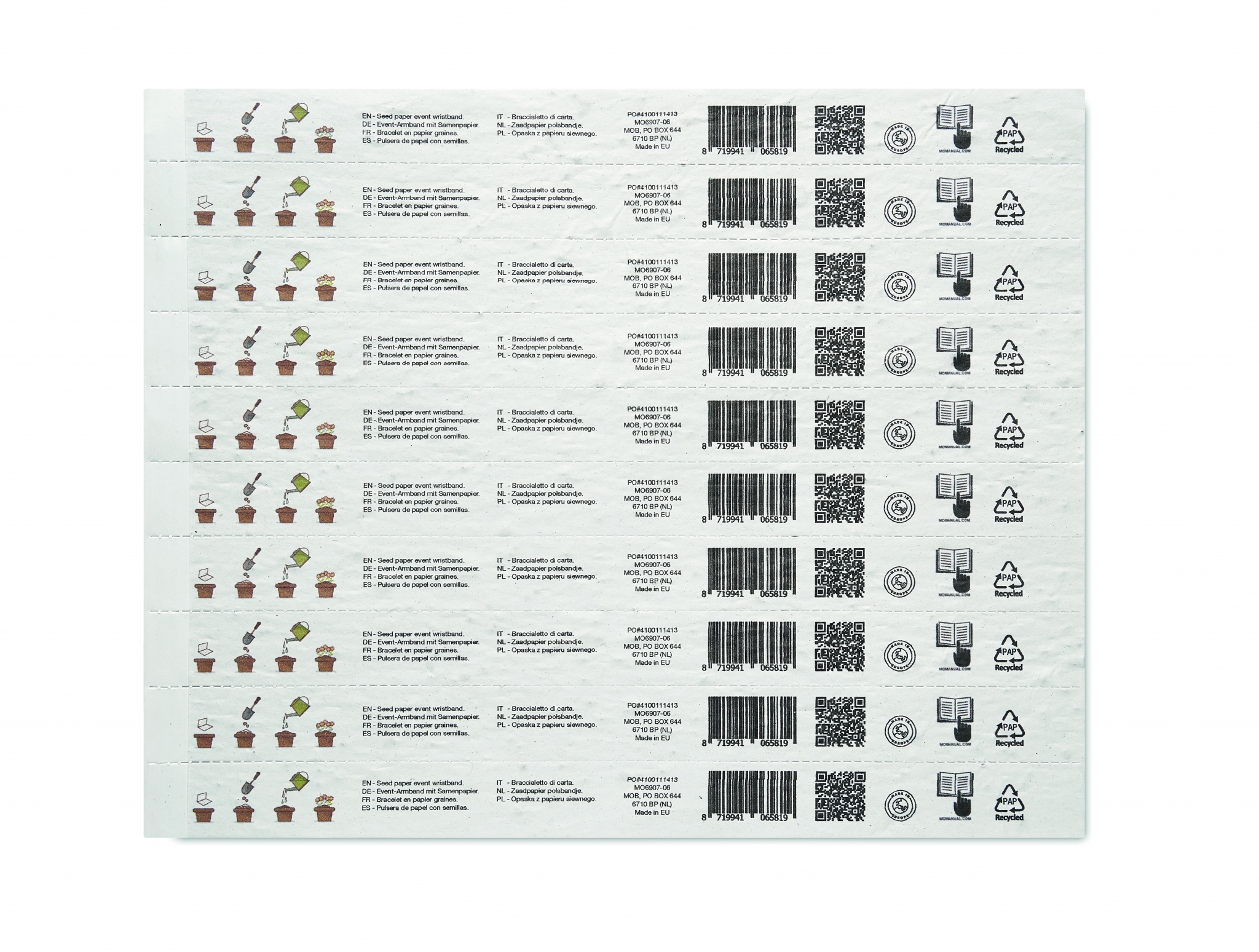 Üks leht 10 ürituse käepaelaga. Metslilleseemnetest taaskasutatud paber. 19mm lai. Valmistatud EL-is.