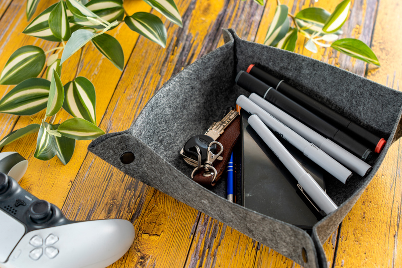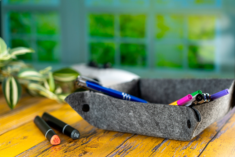 Taaskasutatud vildist hoiukauss. Tänu praktilistele nööpkinnitustele saab kaussi kiiresti hoiustada või tasaseks seada. Kokkupandud kausi mõõdud 15 x 15 cm.