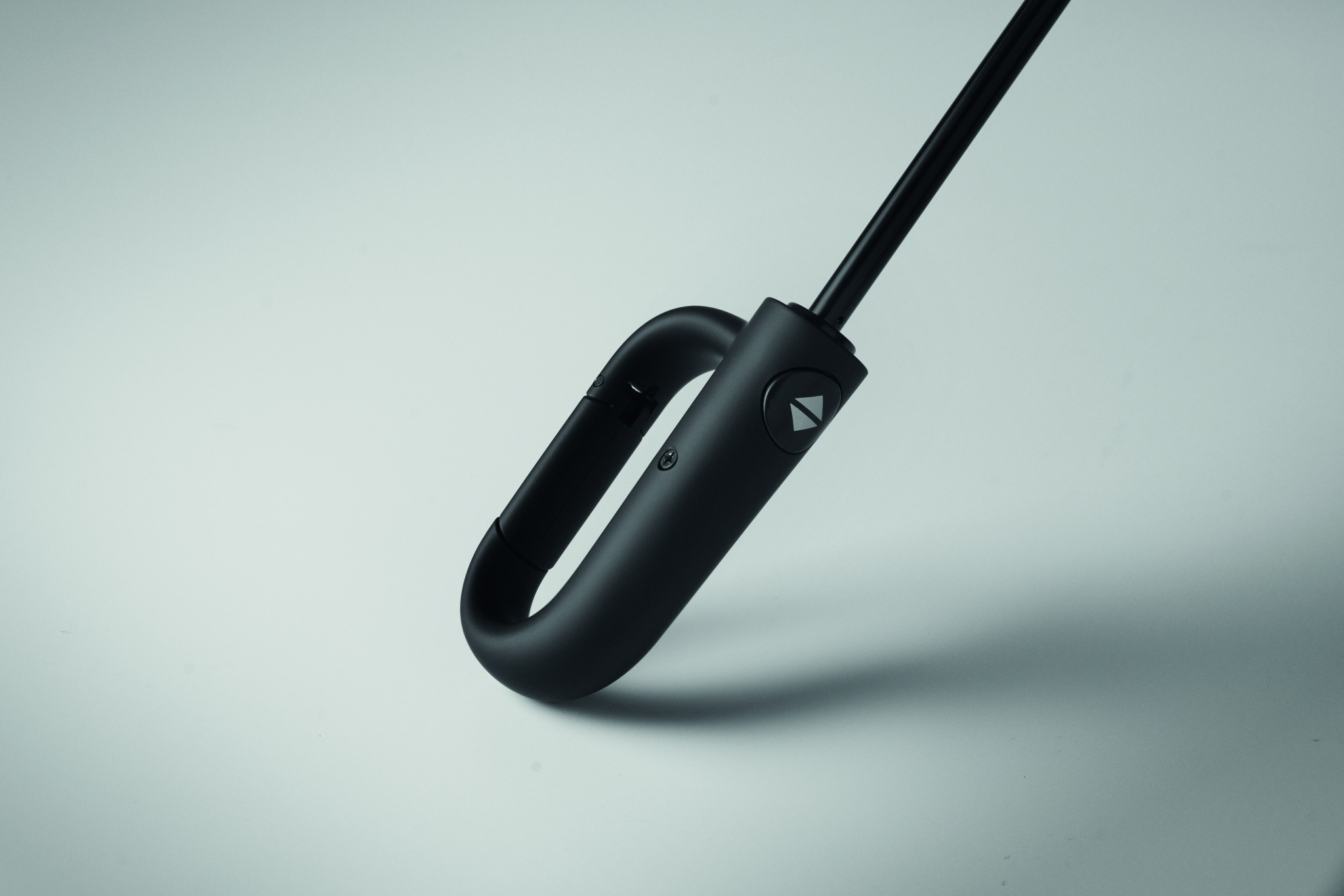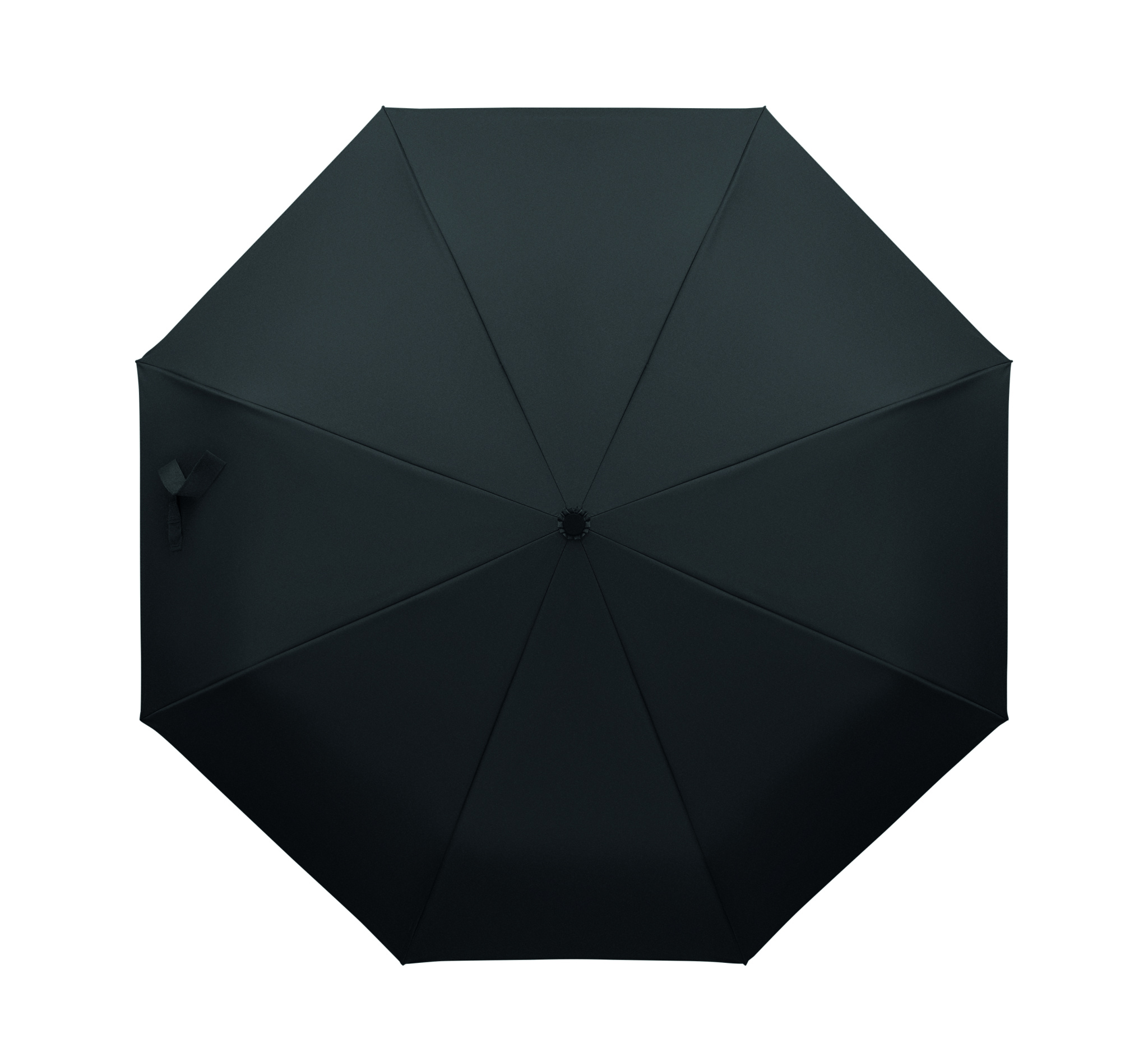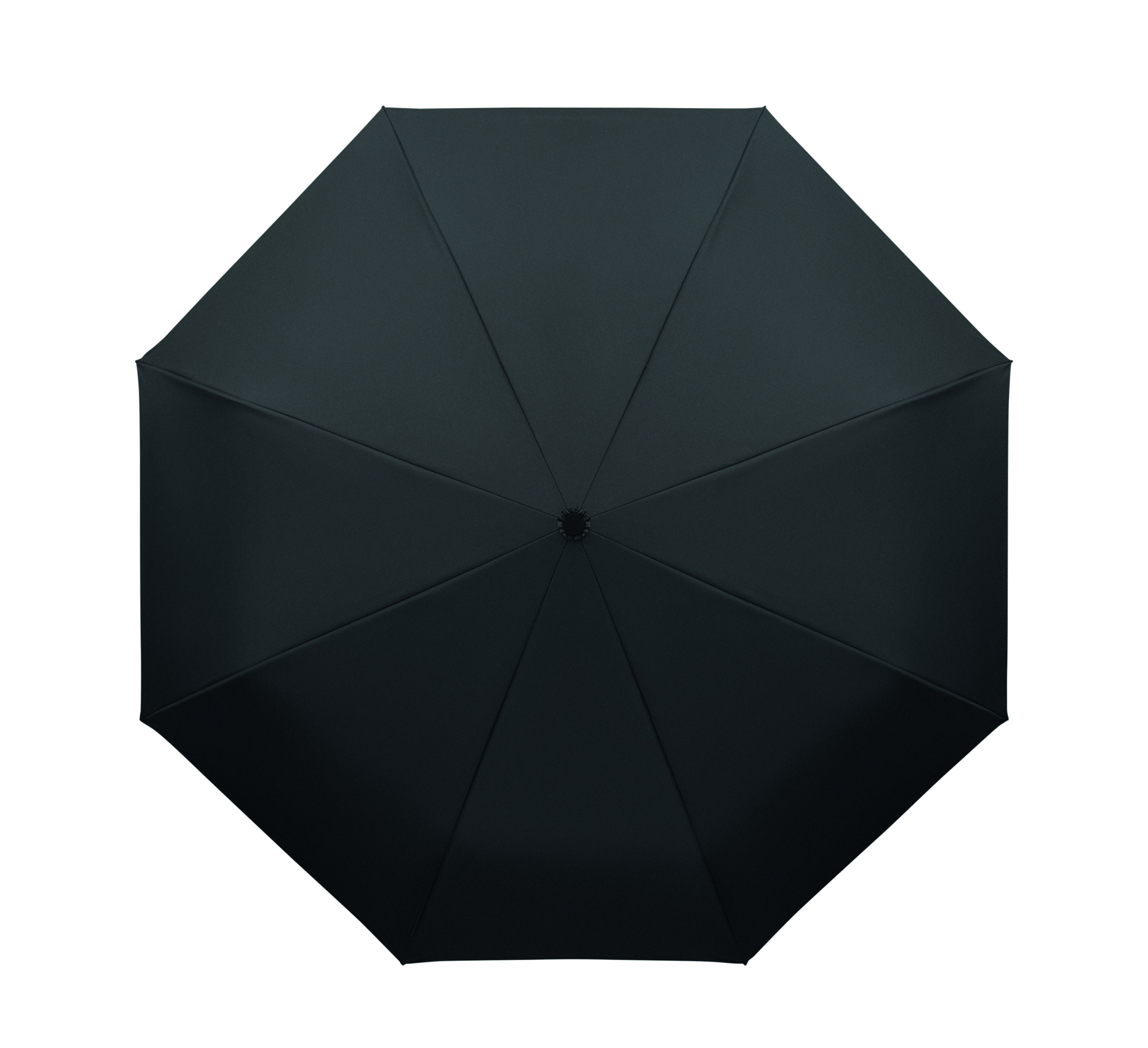 Taitettava 21'' tuulenpitävä sateenvarjo, jossa on täysin musta pinnoitettu lasikuiturunko, jossa on 2 osaa. Lasikuituiset kylkiluut. 190T RPET pongee-paneelit. D-muotoinen karabiinikahva w / kumipinta,. Automaattinen avautuminen ja sulkeminen. Sisältää pussin