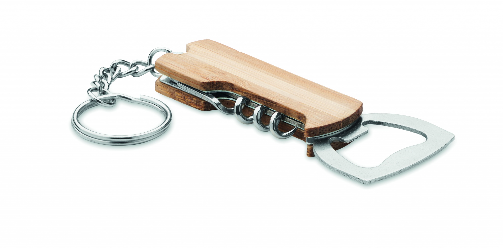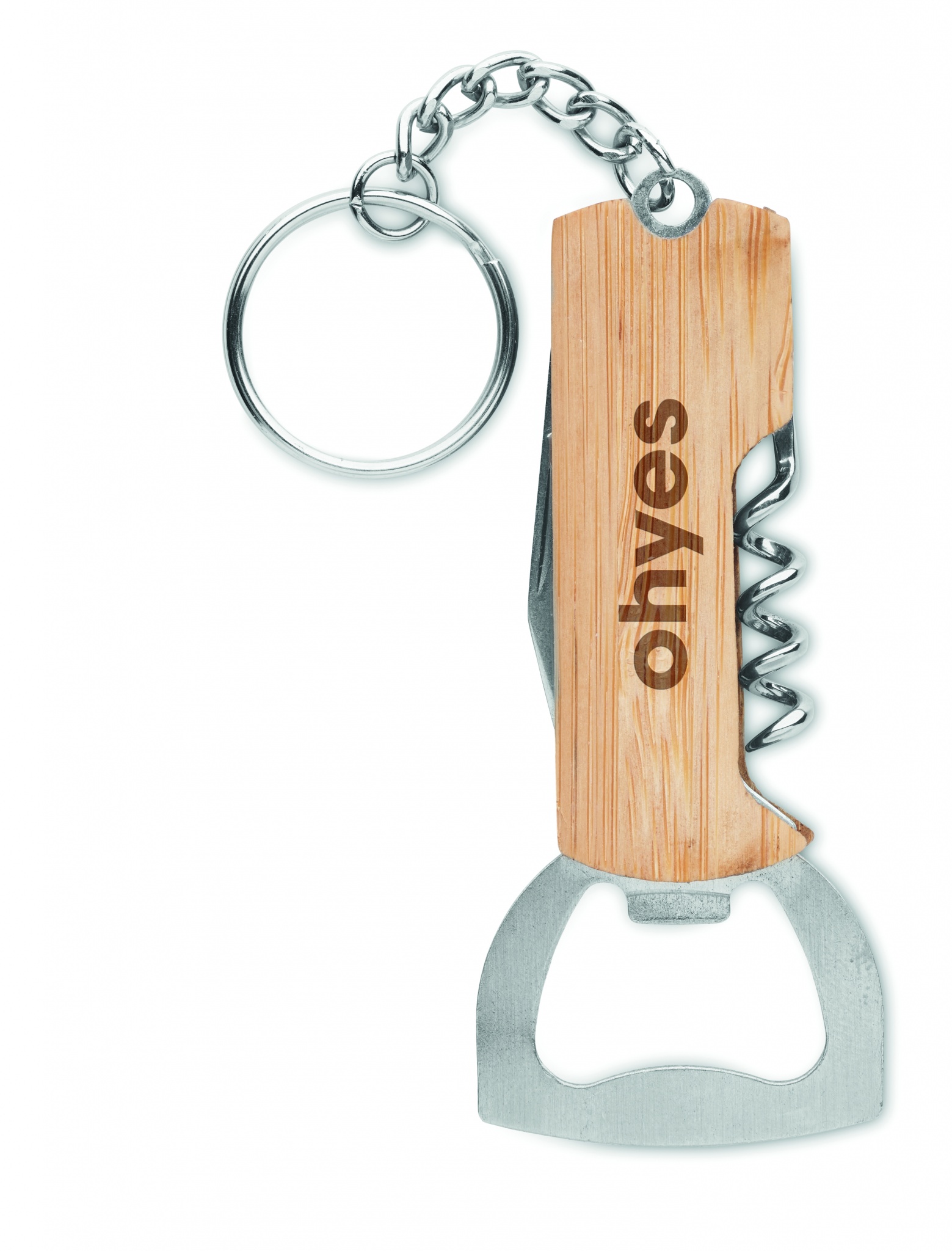 3 in 1 taskutyökalu bambukotelolla ja avainrenkaalla. Sisältää pullonavaajan, korkkiruuvin ja taskuveitsen.