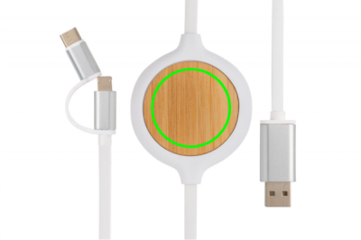 Ainutlaatuinen bambu suunnittelu 3-in-1 latauskaapeli integroidulla 5W langattomalla laturilla. 100 cm:n kaapeli on valmistettu PVC-vapaasta TPE-materiaalista. Tyypillä C ja kaksipuolisella liittimellä IOS- ja Android-laitteille, jotka vaativat mikro-usb:n. Integroidulla 5W langattomalla laturilla voit ladata laitteen yksinkertaisesti asettamalla sen latauspinnalle. Tulo: 5V/2A, 9V/2A. Langaton lähtö: 5V/1A, 9V/1.1A. Kaapelilähtö max 5V/1A.