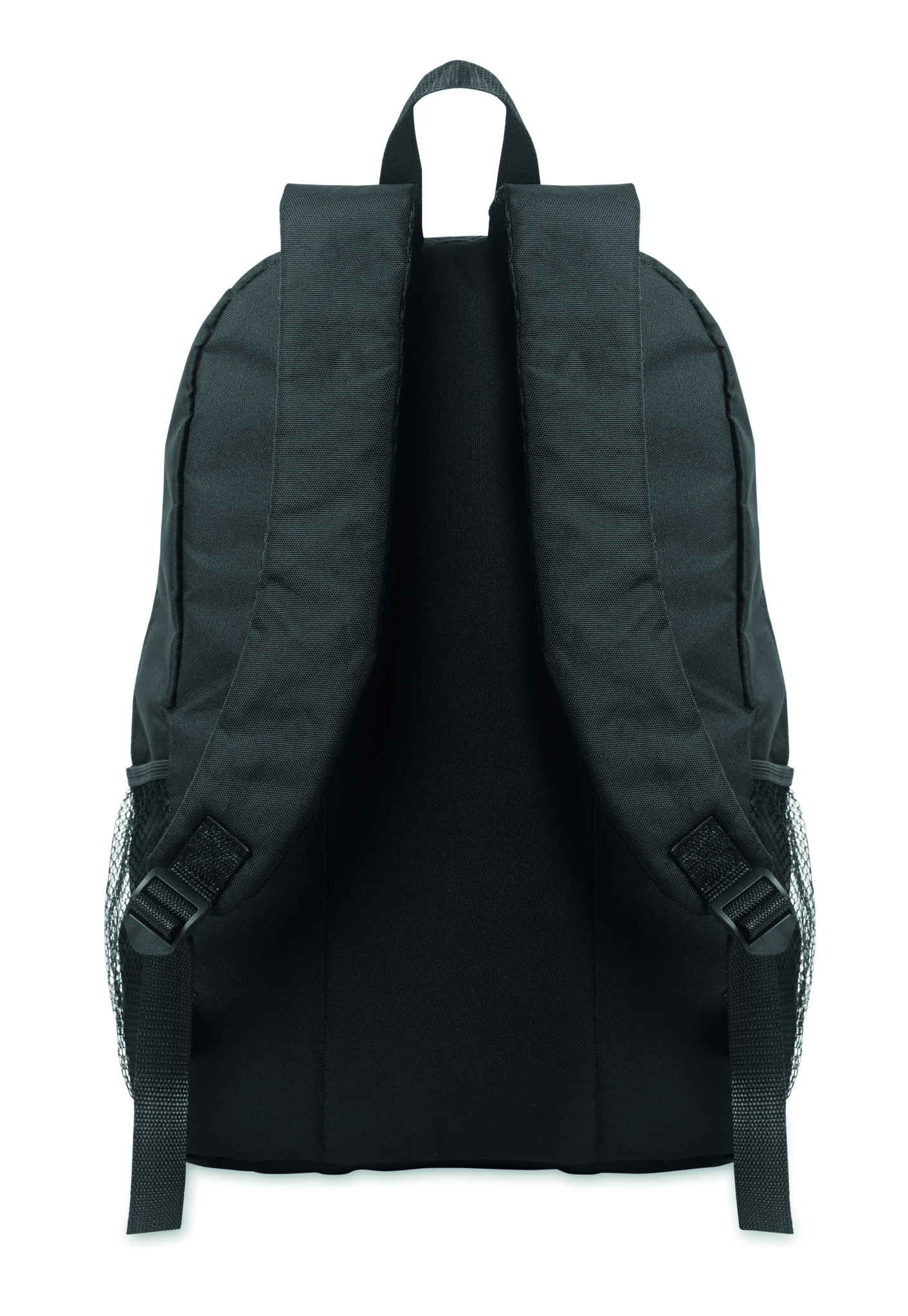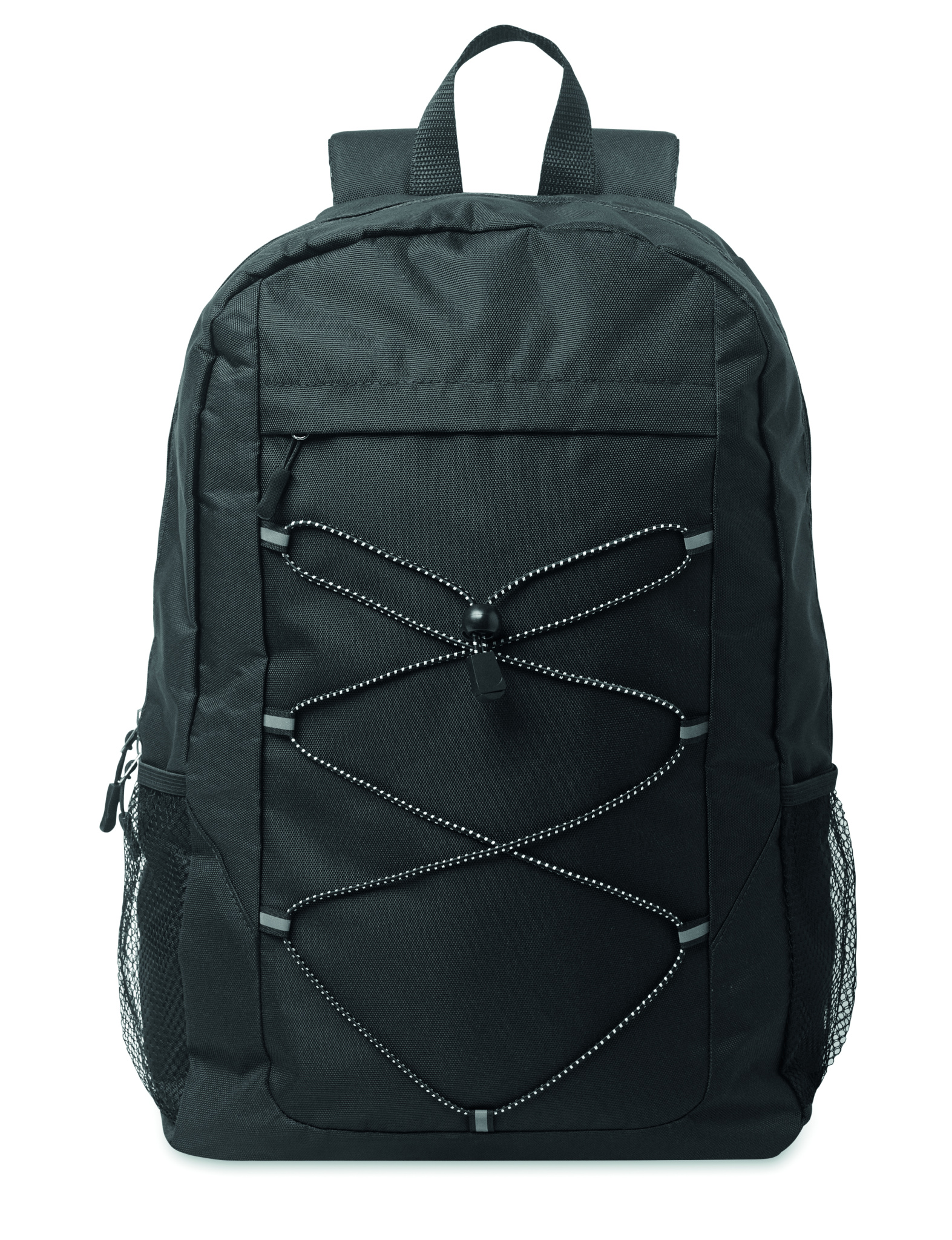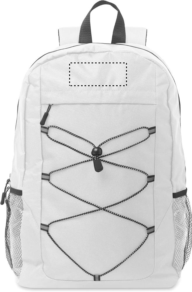 Reppu 600D RPET-polyesteristä koristenauhalla ja vetoketjullisella etupaneelilla. Verkkotaskut molemmilla puolilla.