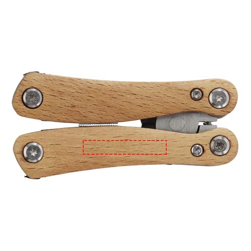 Vahva, kestävä ja kompakti monitoimityökalu, joka on valmistettu korkealaatuisesta ruostumattomasta teräksestä ja sen kahvat pyökistä. Tämä on erinomainen työkalu kaikille partiolaisille, käsityöläisille ja ulkoilijoille. Työkalussa on 12 toimintoa: suuret kärkipihdit, vakiopihdit, vaijerileikkuri, hammastettu terä, pullon/tölkin avaaja, litteä ruuvimeisseli, keskikokoinen litteä ruuvimeisseli, pieni veitsi, Philips-ruuvimeisseli, keskikokoinen veitsi ja viila ja viilapuhdistin. Valmistukseen käytetyn pyökin alkuperä on kestävä, ympäristöystävällinen ja sosiaalisesti vastuullinen. Koko avattuna on 11 x 6 cm ja suljettuna 7,2 x 3,4 cm. Toimitetaan käyttöoppaan kanssa ja pakataan kierrätettyyn pahvilaatikkoon, jonka koko on 9,5 x 5,5 x 2,5 cm. Logomerkintänä suosittelemme ympäristöä säästävää laserkaiverrusta.