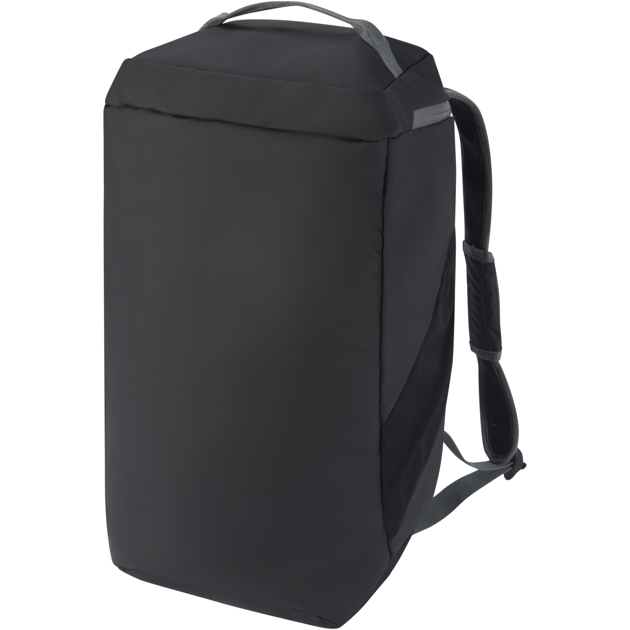 Vedenkestävä monikäyttöinen reppu, jonka osat, vetoketjut mukaan lukien, on valmistettu GRS-sertifioiduista kierrätetyistä materiaaleista. Siinä on tilava päälokero, joka on helppo avata ja jossa on helppo säilyttää tavaroita U:n muotoisen aukon ansiosta. Kaksi vetoketjullista sivutaskua (mukaan lukien lokero kenkiä varten), yksi vetoketjullinen etutasku, verkkotasku vesipullolle takana ja heijastava kaistale näkyvyyttä varten. Tätä laukkua voi kantaa kolmella eri tavalla: Kädessä, olkapään yli tai reppuna, jossa on pehmustetut ja säädettävät olkahihnat. Repun kangas, vuori, nauha ja vetoketjut on valmistettu GRS-kierrätysmateriaaleista. Tilavuus: 35 litraa. PVC-vapaa.